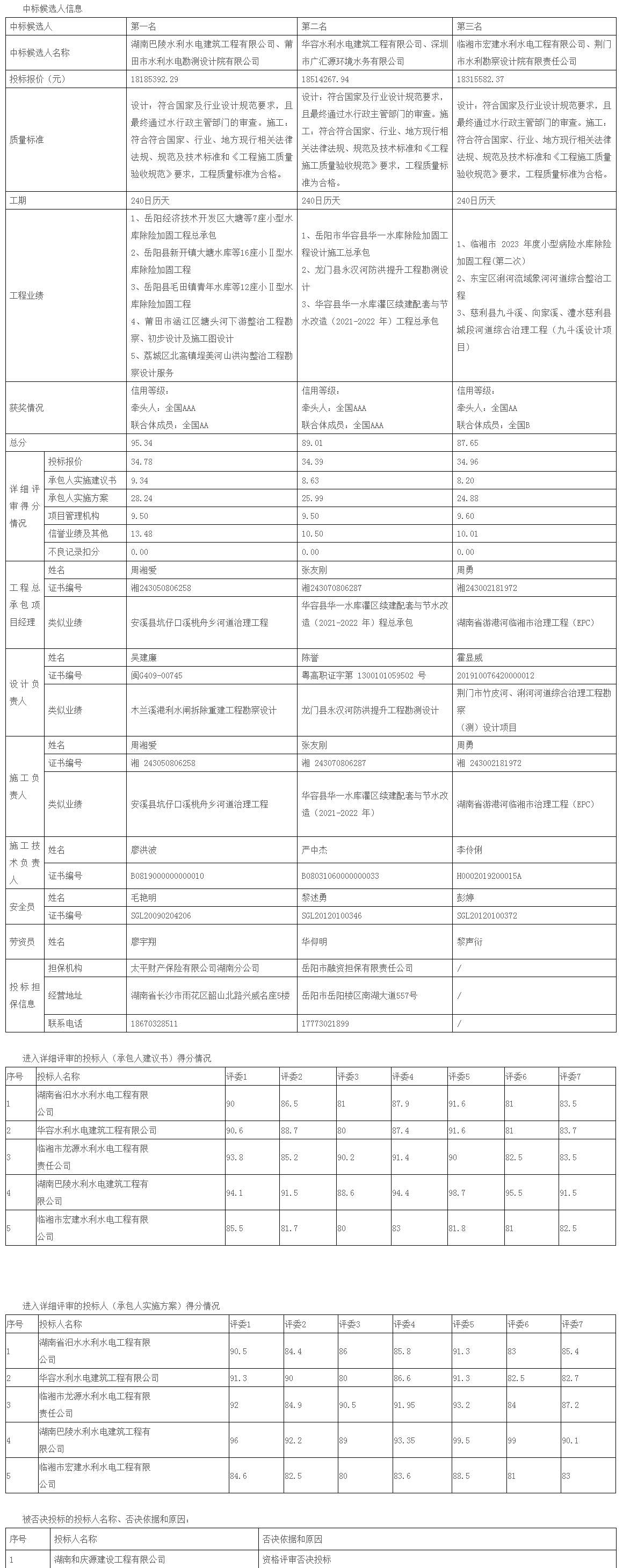 根据招标投标相关法律法规及招标文件的规定,岳阳县新墙河四期治理工程(筻口段、铁山水库段、月田镇段)工程总承包评标工作已经结束,本项目采用综合评估法的评标办法,评标委员会推荐了以下3名中标候选人(排序),现将相关信息予以公示。公示期2024年11月11日至2024年11月14日。