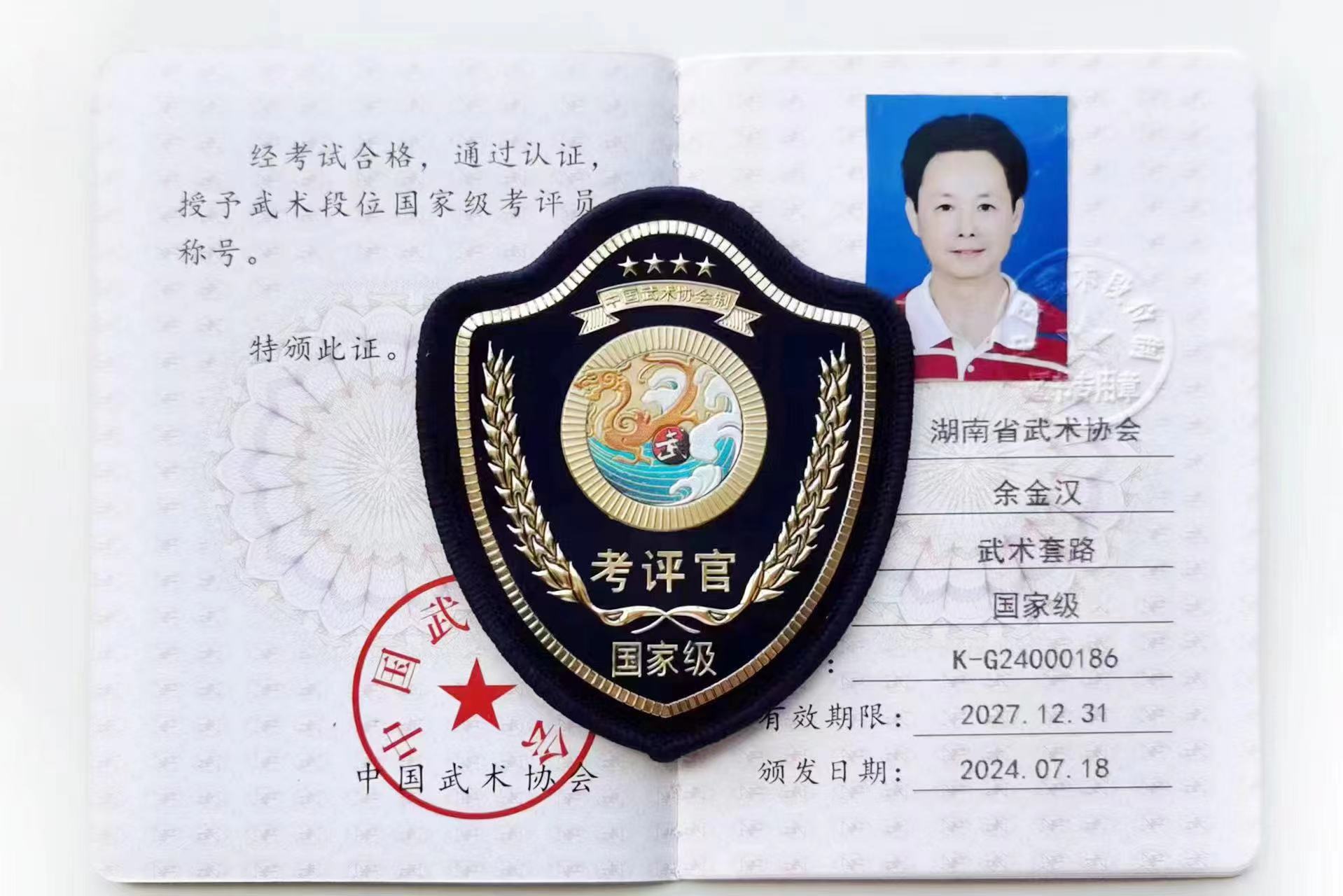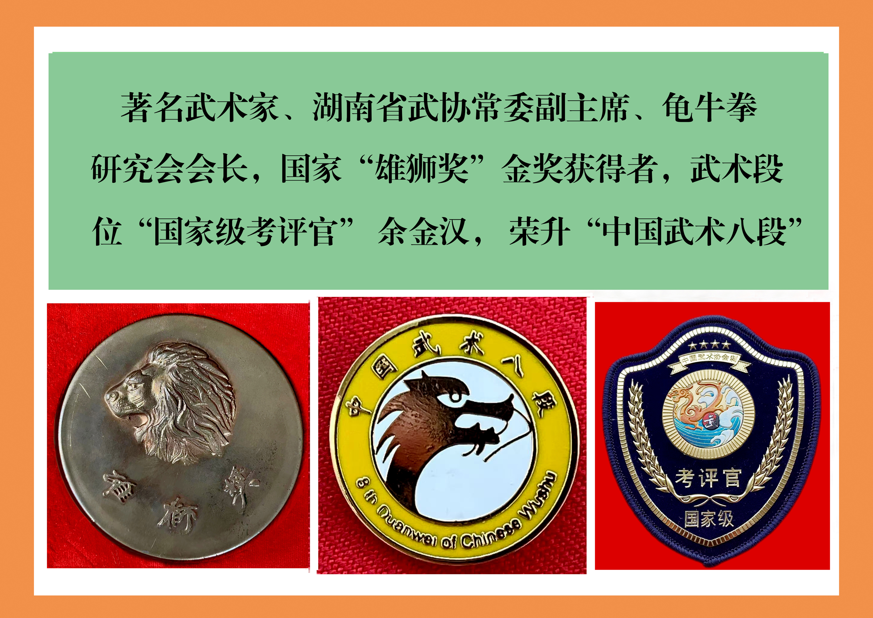 余金汉几十年如一日潜心钻研武术,生命不息、奋斗不止,创造了一个又一个精彩瞬间和非凡成就。现任湖南省武术协会常委、副主席,龟牛拳研究会会长,今年7月参加国家体育总局武术管理中心、中国武术研究院、中国武术协会在秦皇岛举办的中国武术段位制考评员晋级考试中,拳、械技术以9.1分和理论知识96分的优异成绩获得了中国武术段位“国家级考评官”荣誉称号。