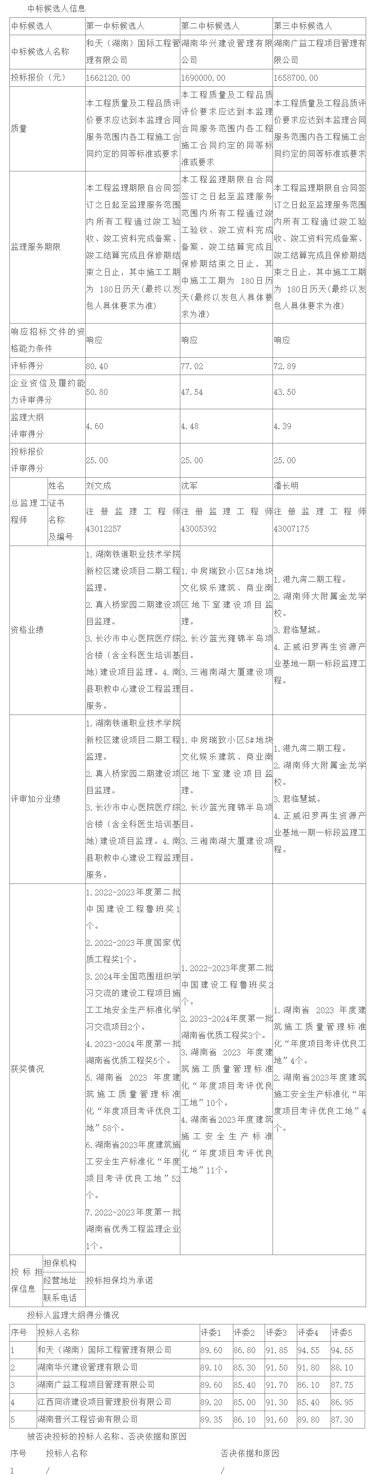 根据招标投标相关法律法规及招标文件的规定,南湖宾馆提质改造项目监理评标工作已经结束,本项目采用湘建监督〔2021〕234号文件规定的综合评估法评标定标,评标委员会推荐了以下3名中标候选人(排序),现将相关信息予以公示。公示期:2024年12月10日至2024年12月13日。