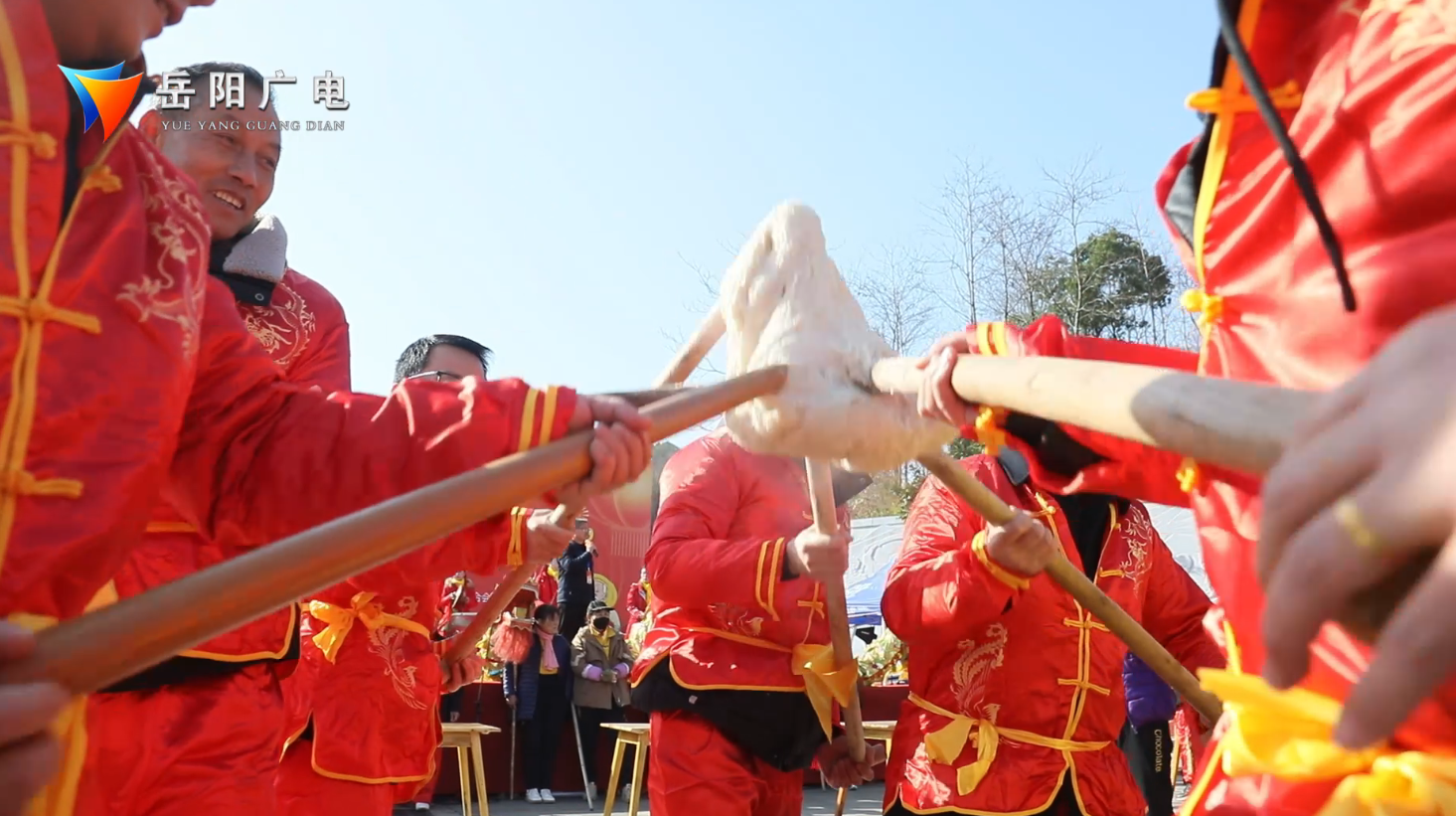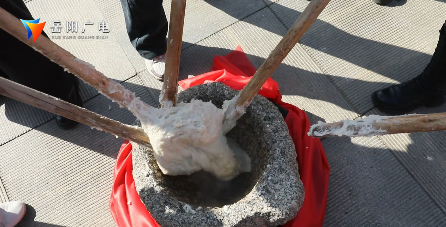 活动现场,歌舞、花鼓戏、乐器合奏等精彩节目轮番上演。玩龙、舞狮、丰收锣鼓、竹马戏等民俗节目,尽显当地文化底蕴。打糍粑比赛环节,瞬间将现场气氛点燃,刚出木桶冒着热气的糯米饭倾入一排的石槽中,粒粒饱满的糯米,泛着温润的光泽。参赛者们手法娴熟,边用木槌捶打边转动,让糯米饭均匀受力。期间,吆喝声此起彼伏,交织成一曲充满力量感的劳动号子。