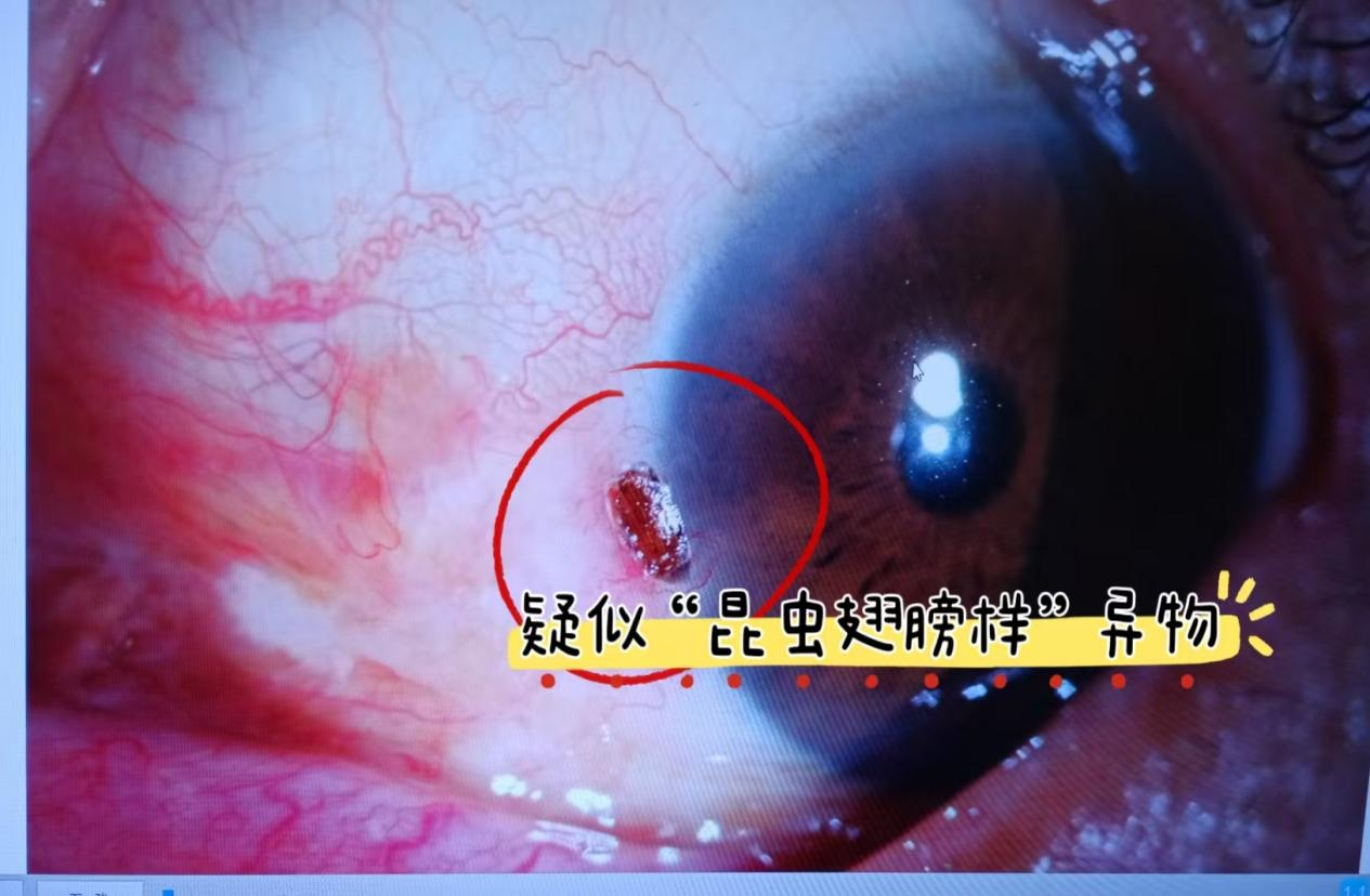 近日,岳阳爱尔眼科医院前往葛大爷当地卫生室开展义诊活动,义诊现场的医生在为葛大伯检查时,惊讶地发现他的左眼角膜和巩膜边缘竟然有一片疑似“昆虫翅膀”的异物。这片翅膀紧紧地嵌入在葛大伯的左眼角膜和巩膜边缘处。