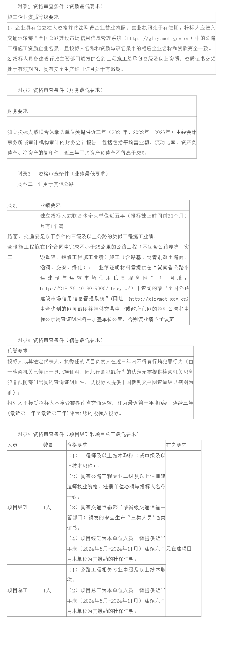 3.1 本次招标要求投标人须具备公路工程施工总承包叁级及以上资质。具有类似项目业绩(详见附录3资格审查条件(业绩最低要求)),并在人员、设备、资金等方面具有相应的施工能力。