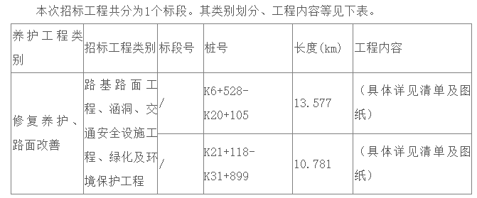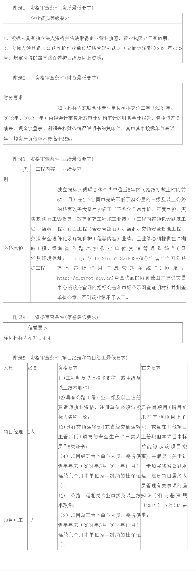 3.1 本次招标要求投标人须具备《公路养护作业单位资质管理办法》(交通运输部令2021年第22号)规定取得的路基路面养护乙级及以上资质、投标人近5年内(指投标截止时间前60个月)在1个合同中完成不低于24公里的三级及以上公路的路面改善大修养护施工(不包含日常养护、年度养护、灾毁重建、改建扩建工程施工业绩)(工程内容须包含路基工程、路面工程(含沥青路面)、涵洞、交通安 全设施工程、绿化及环境保护工程等内容)业绩,并在人员、设备、资金等方面具有相应的施工能力。