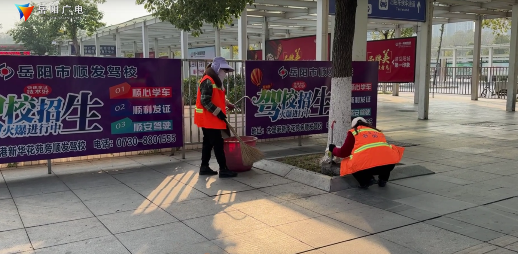 在岳阳东站附近,环卫工人对主次干道、广场上的落叶、垃圾等进行清扫,每隔几十米便能看到身穿工作服的环卫工人戴着手套,拿着扫帚忙活着,他们坚守岗位,默默耕耘。景区环卫工人用他们勤劳的双手,为市民游客营造一个干净、整洁的节日环境。