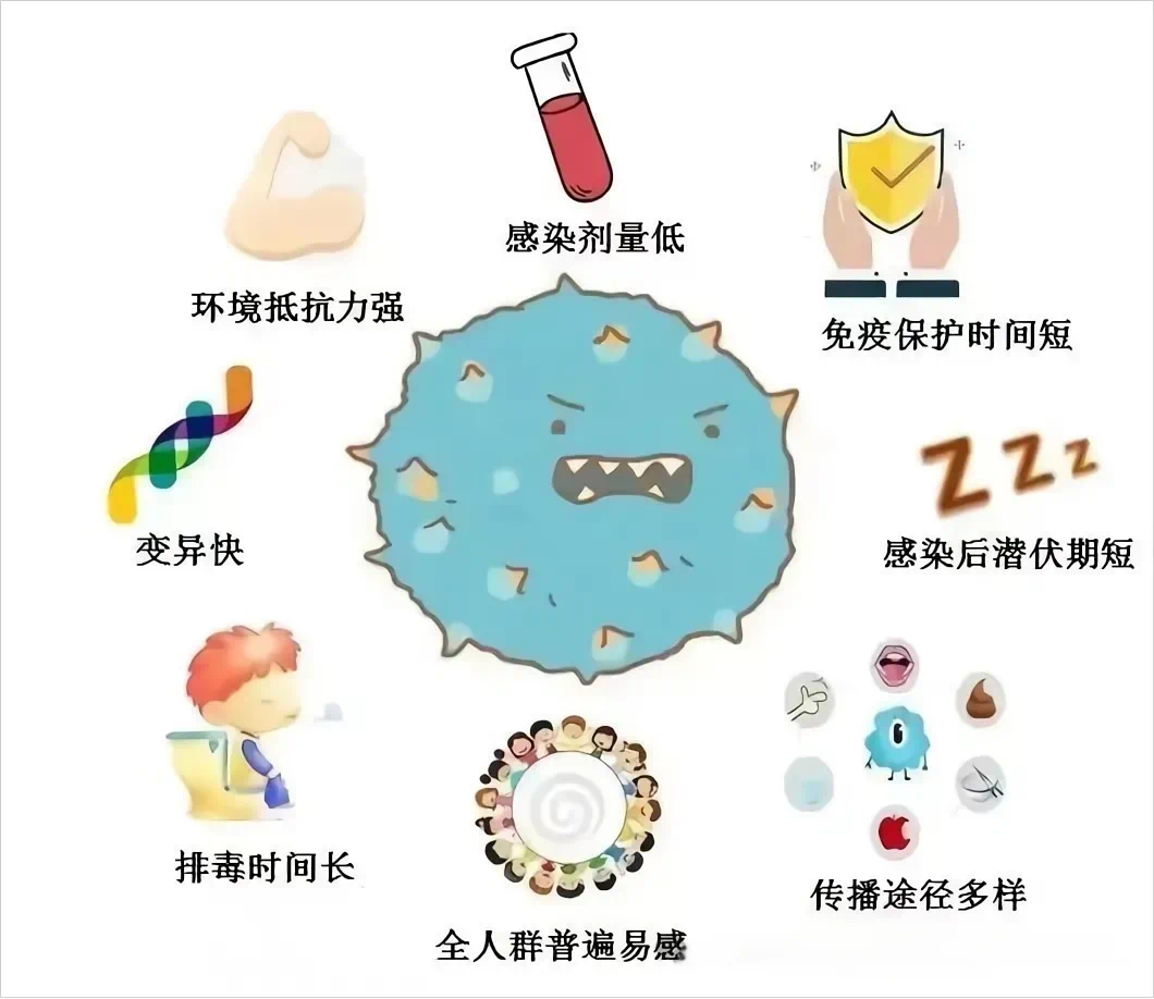 (4)变异快,感染过后可再感染(类似新冠),目前无特效疫苗(不像轮状病毒,有特效疫苗进行预防)。