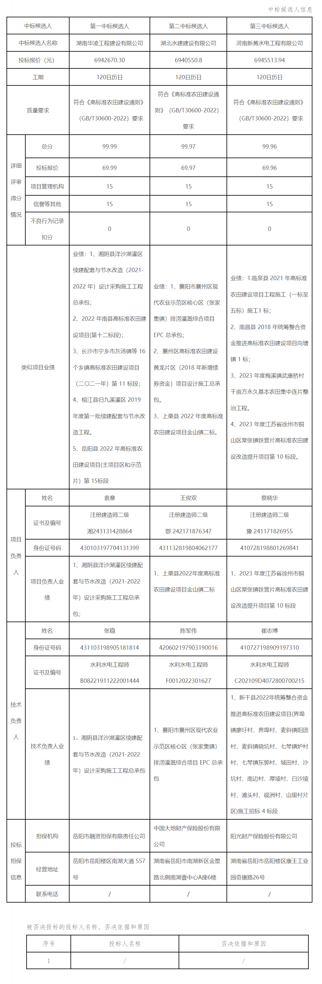 根据招标投标相关法律法规及招标文件的规定,岳阳市岳阳县高标准农田建设结余资金项目(二〇二三年)于2025年01月16日评标工作已经结束, 在岳阳县农业局促进股监督下,依法组建的评标委员会按照招标文件确定的评标原则和评标办法进行了细致的评审,并推荐本项目中标候选人(排序)排名如下: