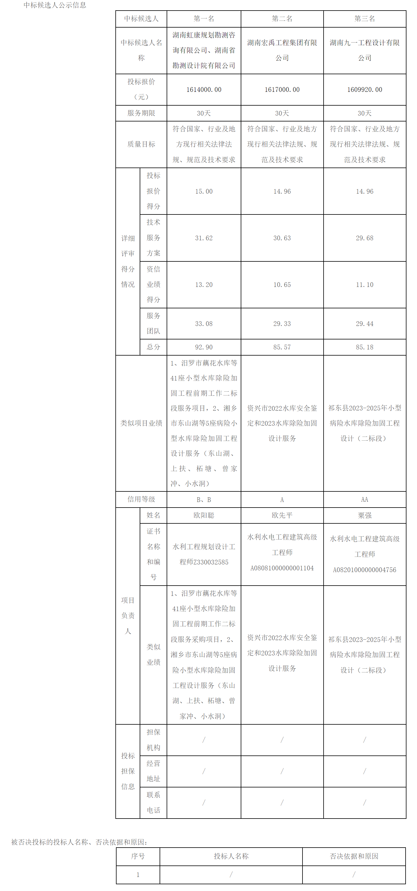 湖南建科工程项目管理有限公司受汨罗市水利建设事务中心的委托,代理汨罗市东风等4座中型水闸除险加固工程可研、初设阶段前期工作招标,2025年1月17日(北京时间)在岳阳市公共资源交易中心进行了公开开标,在汨罗市招标投标工作领导小组办公室监督下,依法组建的评标委员会按照招标文件确定的评标原则和评标办法进行了细致的评审,并推荐本项目中标候选人(排序)排名如下: