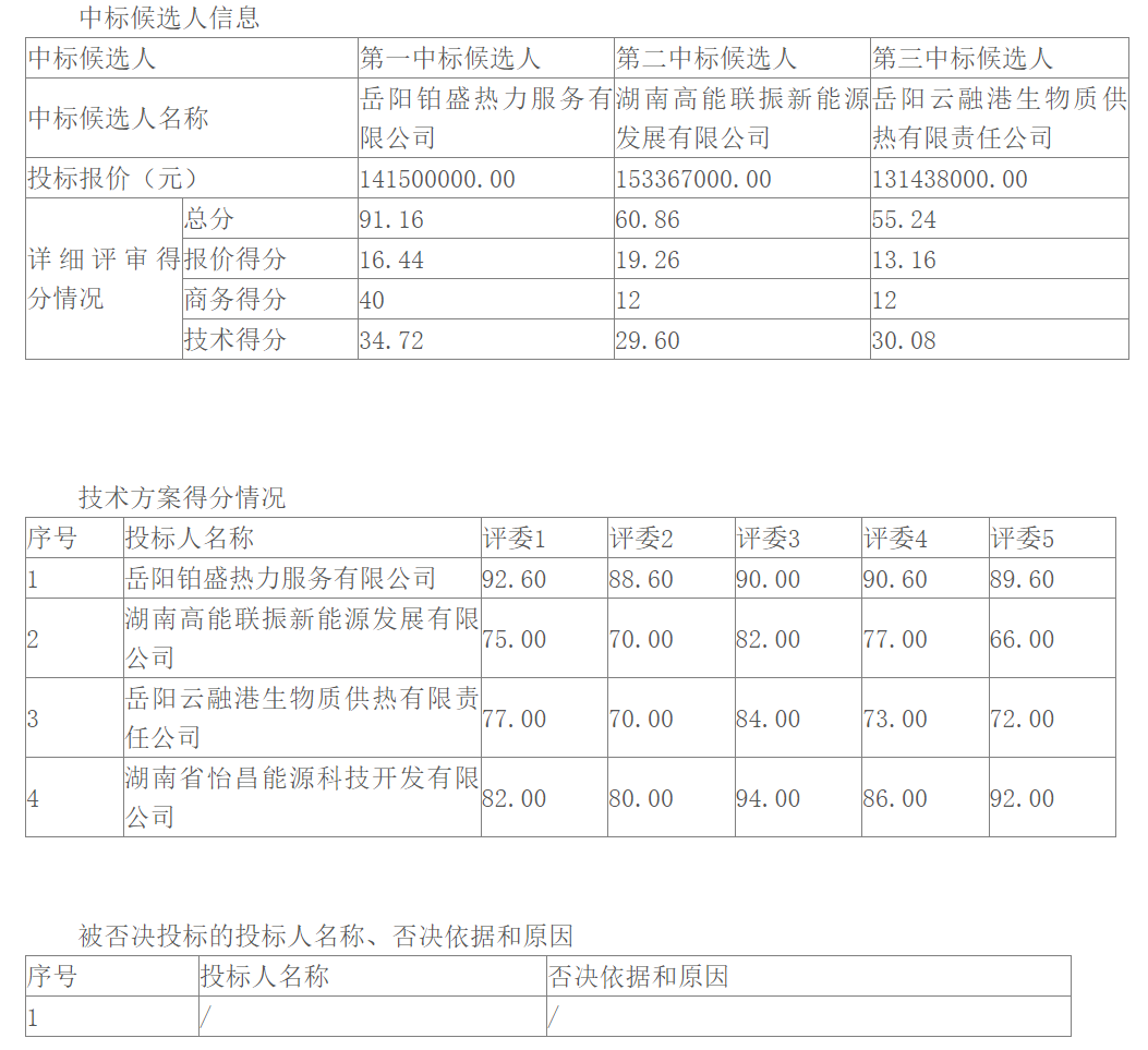 根据招标投标相关法律法规及招标文件的规定,岳阳绿色化工高新区云溪片区公共管廊(一期)公用工程能源转供服务项目评标工作已经结束,本项目采用综合评估法的评标办法,评标委员会推荐了以下3名中标候选人(排序),现将相关信息予以公示。公示期2025年1月20日至2025年1月23日。