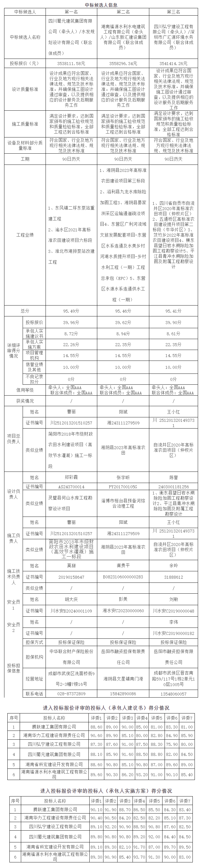 根据招标投标相关法律法规及招标文件的规定,湘阴县石塘镇外排泵站设备更换及许家台主排渠水毁修复工程总承包评标工作已经结束,本项目采用综合评估法的评标办法,评标委员会推荐了以下3名中标候选人(排序),现将相关信息予以公示。公示期2025年2月12日至2025年2月17日。
