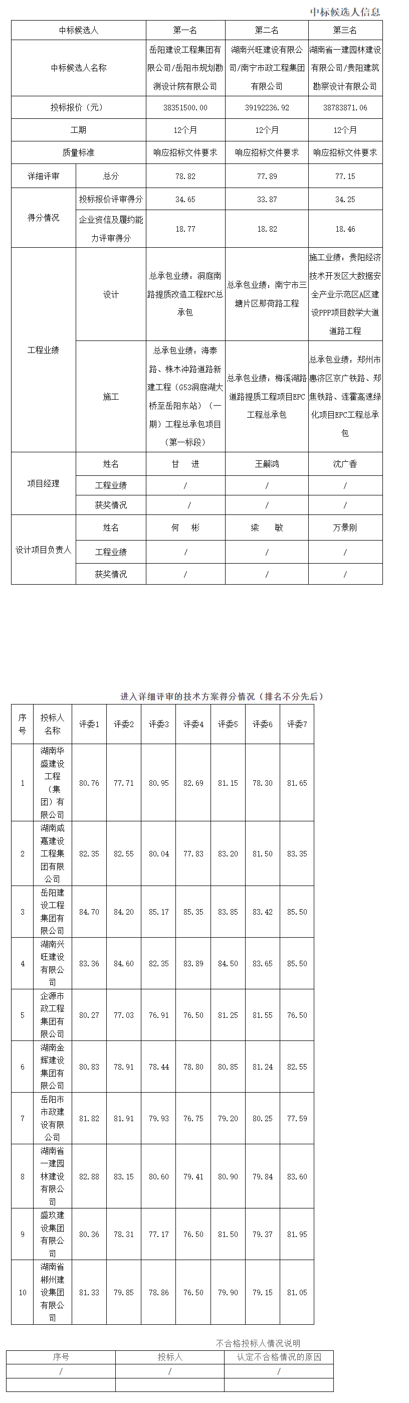 根据招标投标相关法律法规及招标文件的规定,岳阳桂花园路(北环线-仓储路)及仓储路(桂花园路-吉家湖路)道路工程项目评标工作已经结束,本项目采用湘建监督[2024] 34 号文件规定的“综合评估法”评标定标,评标委员会推荐了以下3名中标候选人(排序),现将相关信息予以公示。公示期2025年2月12日至2025年2月17日。