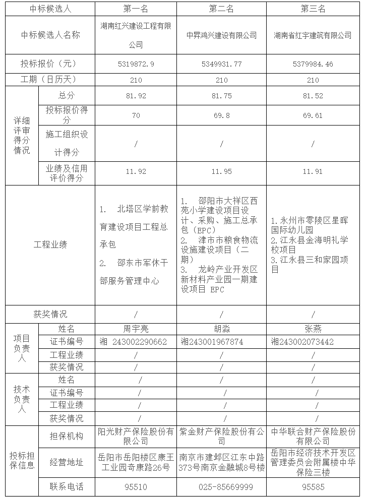 根据招标投标相关法律法规及招标文件的规定平江县伍市镇伍市学校运动场、南门及围墙建设项目评标工作已经结束,本项目采用经评审的最低投标价法的评标办法,评标委员会推荐了以下3名中标候选人(排序),现将相关信息予以公示。公示期2025年2月12日至2025年2月17日。