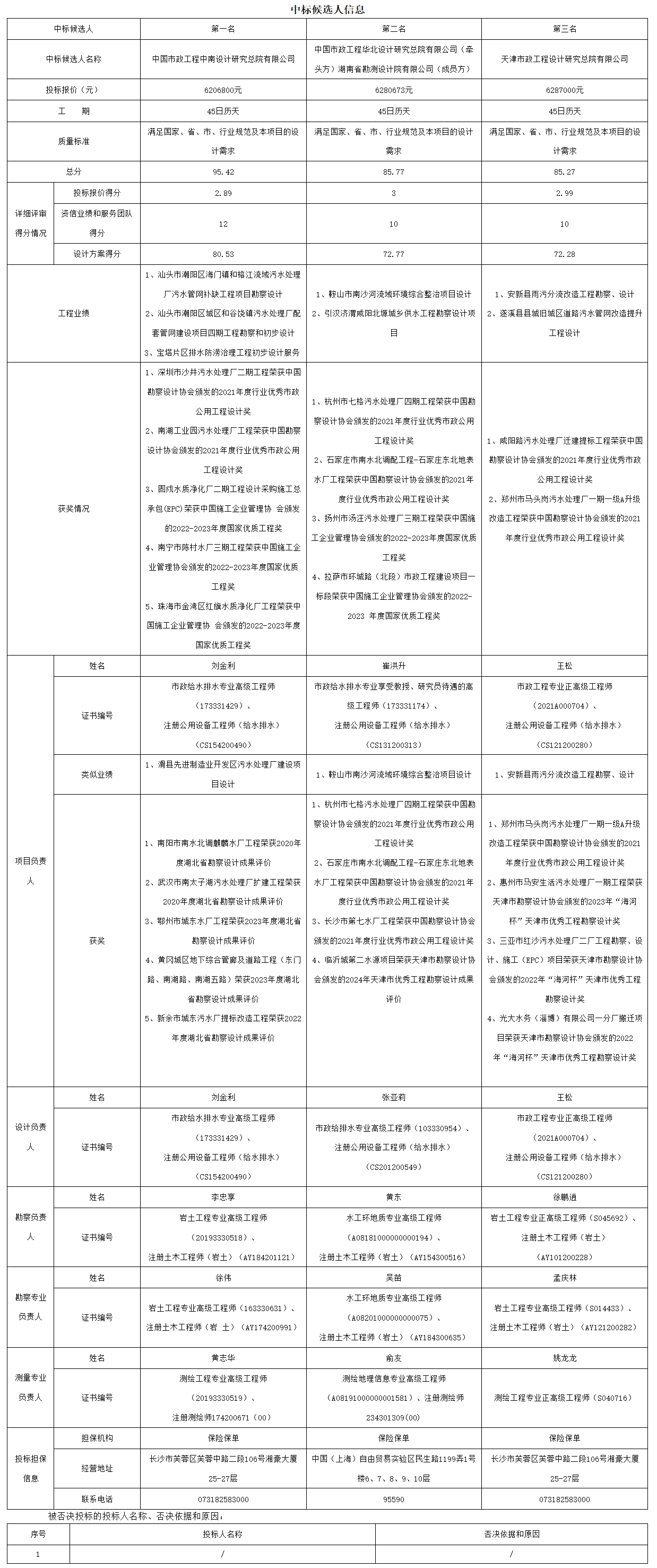 根据招标投标相关法律法规及招标文件的规定,岳阳市城区铁山供水地下管道改造工程(一期)初步设计(第二次)评标工作已经结束,本项目评标办法采用综合评估法,评标委员会推荐了以下3名中标候选人(排序),现将相关信息予以公示。