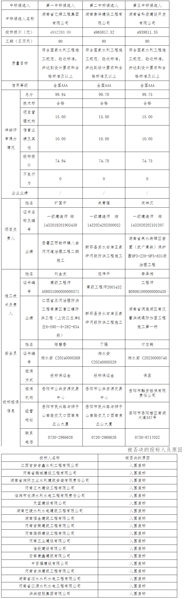 湖南兴和招标有限责任公司受平江县水利建设事务中心的委托,代理平江县汨罗江平江大桥段右岸防洪治理工程招标,2025年2月17日09时30分(北京时间)在岳阳市公共资源交易中心进行了公开开标,在平江县水利水电工程建设招投标管理办公室监督下,依法组建的评标委员会按照招标文件确定的评标原则和评标办法进行了细致的评审,并推荐本项目中标候选人。于2025年2月18日发布了中标候选人公示。2025年2月20日收到了异议,同时暂停了本标段的招投标活动。现异议处理完毕,恢复中标候选人公示如下: