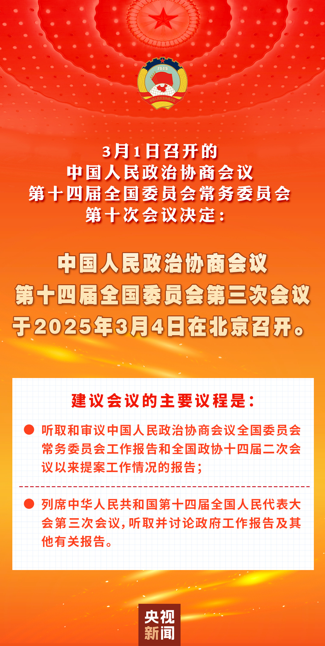 3月1日召开的中国人民政治协商会议第十四届全国委员会常务委员会第十次会议决定:中国人民政治协商会议第十四届全国委员会第三次会议于2025年3月4日在北京召开。