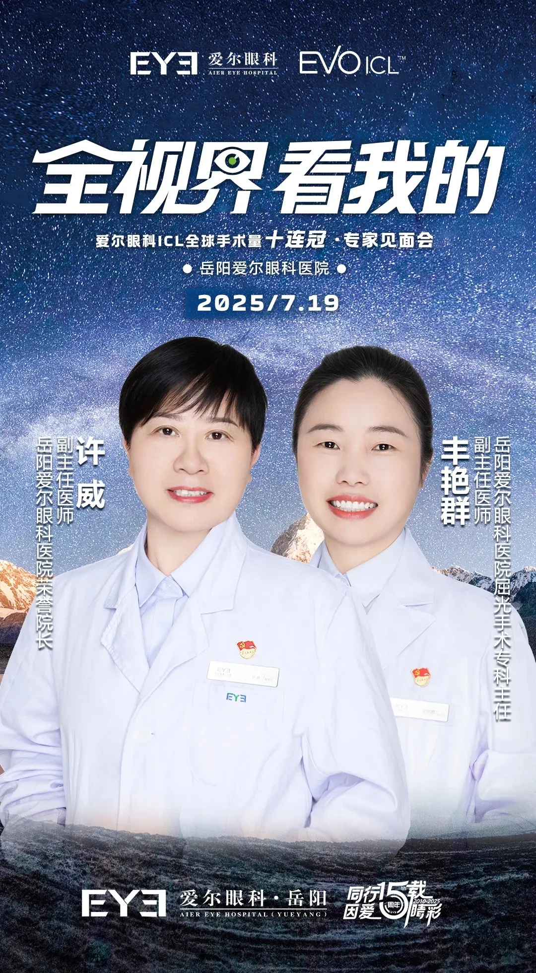 岳阳广电全媒体7月16日讯(通讯员/冯月)2025年7月19日(周五),岳阳爱尔眼科医院将举办 “全视界 看我的 —— 爱尔眼科ICL全球手术量10连冠专家见面会”。本次活动旨在为近视患者提供专业的近视手术咨询与指导,特别邀请岳阳爱尔眼科医院院长许威及屈光手术科主任丰艳群现场答疑,帮助患者深入了解这一越来越受到中低度数人群关注的近视矫正方案。