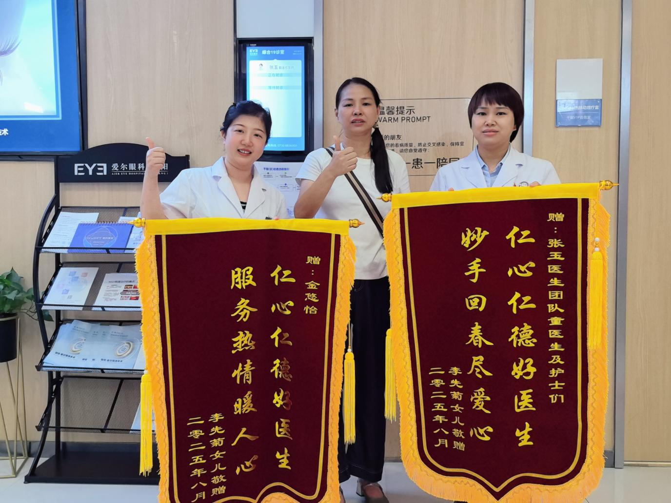 岳阳广电全媒体9月8日讯(通讯员/余倩)近日,76岁的李先菊阿姨的家属将两面写有“仁心仁德好医生,妙手回春尽爱心”“仁心仁德好医生,服务热情暖人心”的锦旗送到岳阳爱尔眼科医院综合眼病科副主任张玉及其医护团队手中,感谢医护团队通过分阶段手术,彻底解决了困扰她母亲两年的双眼慢性泪囊炎。