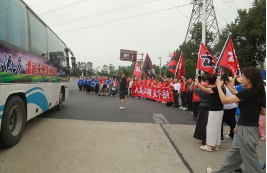 湘超“巴蛇之争”10月3日晚将在岳阳奥体中心体育场打响。下午2点38分,7辆满载永州球迷队的大巴刚下岳阳高速,就被眼前这场面给震住了——身着统一红色服饰的岳阳球迷化作一道极具仪式感的“流动欢迎长廊”,敲锣打鼓震天响,整齐嘹亮欢迎声响彻现场 。全国道德模范李国武同岳阳球迷志愿者热情相迎,一一赠送每位永州球迷伴手礼——“中华老字号”香菇酱。