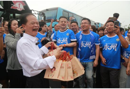 李国武满脸笑容说,欢迎永州球迷到岳阳做客,常来常往。永州球迷高兴接过伴手礼,开心说,岳阳球迷太客气了。岳阳企业家太给力了。