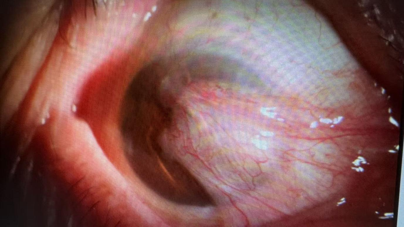 (图一:眼前段照相下巨大型翼状胬肉如图所示)