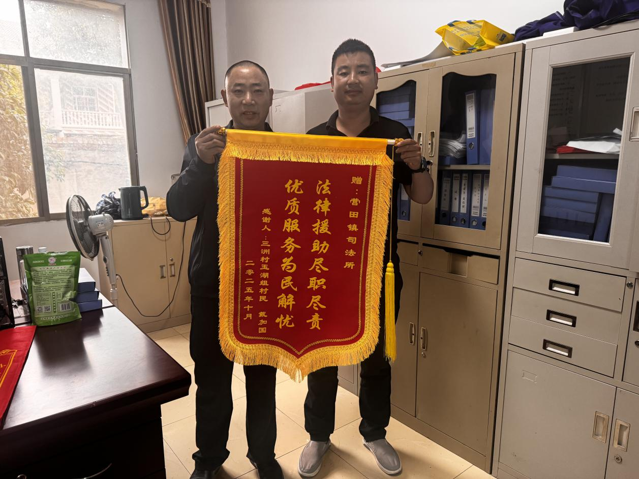 岳阳广电全媒体10月15日讯(通讯员/易杨)10月13日,屈原管理区营田镇三洲村村民戴加国将一面印有“法律援助尽职尽责,优质服务为民解忧”字样的锦旗,送至营田司法所,感谢司法所及镇人民调解委员成功调解其孙女意外受伤事件。