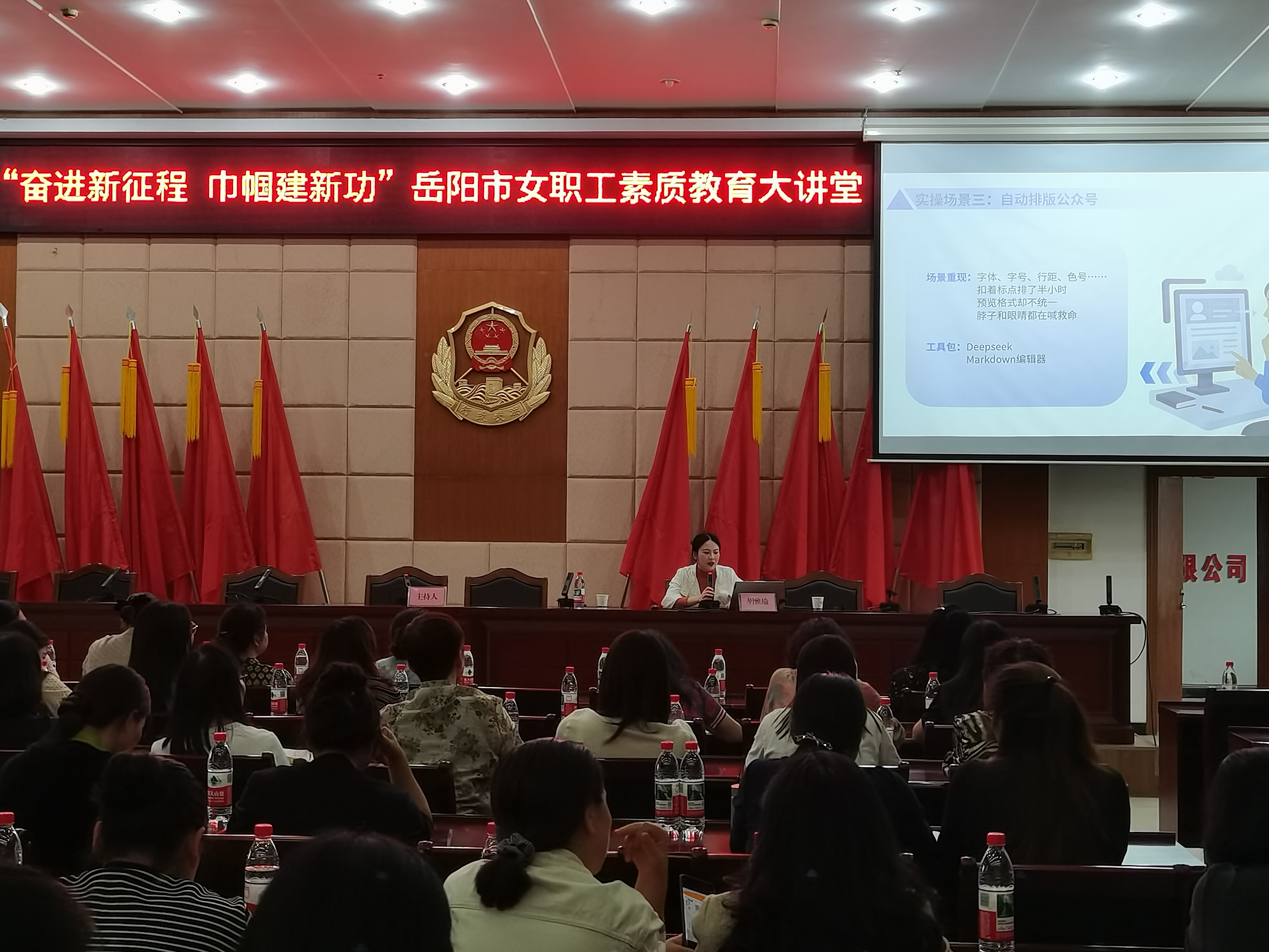 为积极响应市总工会女职工委员会在全市女职工中开展“奋进新征程 巾帼建新功”素质教育活动,持续提升女职工思想素质和文化素质,10月15日下午,岳阳市交通运输综合行政执法支队工会邀请市女职工芙蓉公益讲堂讲师--胡雅瑜为支队机关及直属机构女职工代表70余人,上了一堂题为“从加班到高效,听完就会的AI第一课”的素质教育公益课。