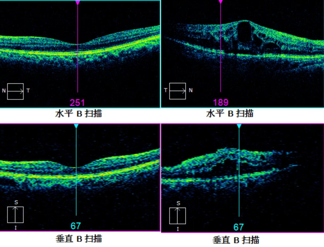 (图二:眼底 OCT 检查左右眼对比如图所示)