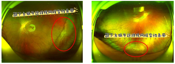 在眼底病科的细致检查中,医生发现柳同学双眼结膜无充血,角膜透明,前房深清,眼部前段情况相对良好。随后的散瞳检查结果显示,其双眼晶状体透明,视网膜在位,但右眼颞上及下方、左眼颞下均出现蜗牛迹样视网膜变性条带,变性区边缘还可见到部分玻璃体视网膜牵拉。这一结果清晰揭示了柳同学视力异常的根源 —— 视网膜变性,而此前出现的闪光感正是视网膜变性发出的危险信号。