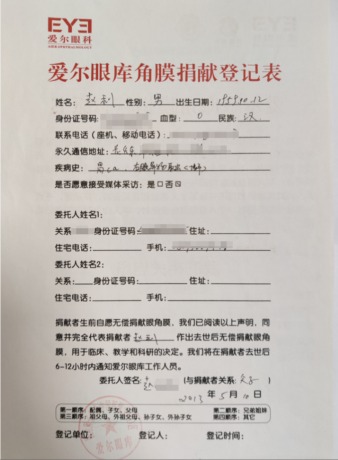 “捐献眼角膜”这份约定的起点,藏在一场与病痛的对抗里。2012年,赵利被确诊胃癌,生命突如其来的考验,没有让他陷入消沉,反而让他开始思考“生命的余温该如何传递”。在接受完胃大部分切除手术后,他向家人提出了一个令人动容的想法:“我想签角膜捐献志愿书,要是走了能帮别人看见,也算没白来这世上一趟。”2013年5月10日,赵利在家人的支持下联系上爱尔眼库岳阳角膜接收站,坚定地签下了角膜捐献志愿书。这份抉择,既是他军人本色的延续,是工匠精神的升华,更是对世间最纯粹的大爱表达——他用一生践行奉献,最终以“捐献光明”的方式,让生命在他人眼中延续。从2013签下志愿书的坚定,到2025年生命终点的无私馈赠,赵利用十二年的坚守,将一位老兵的忠诚、一位工匠的执着,化作了照亮他人前路的希望之光。