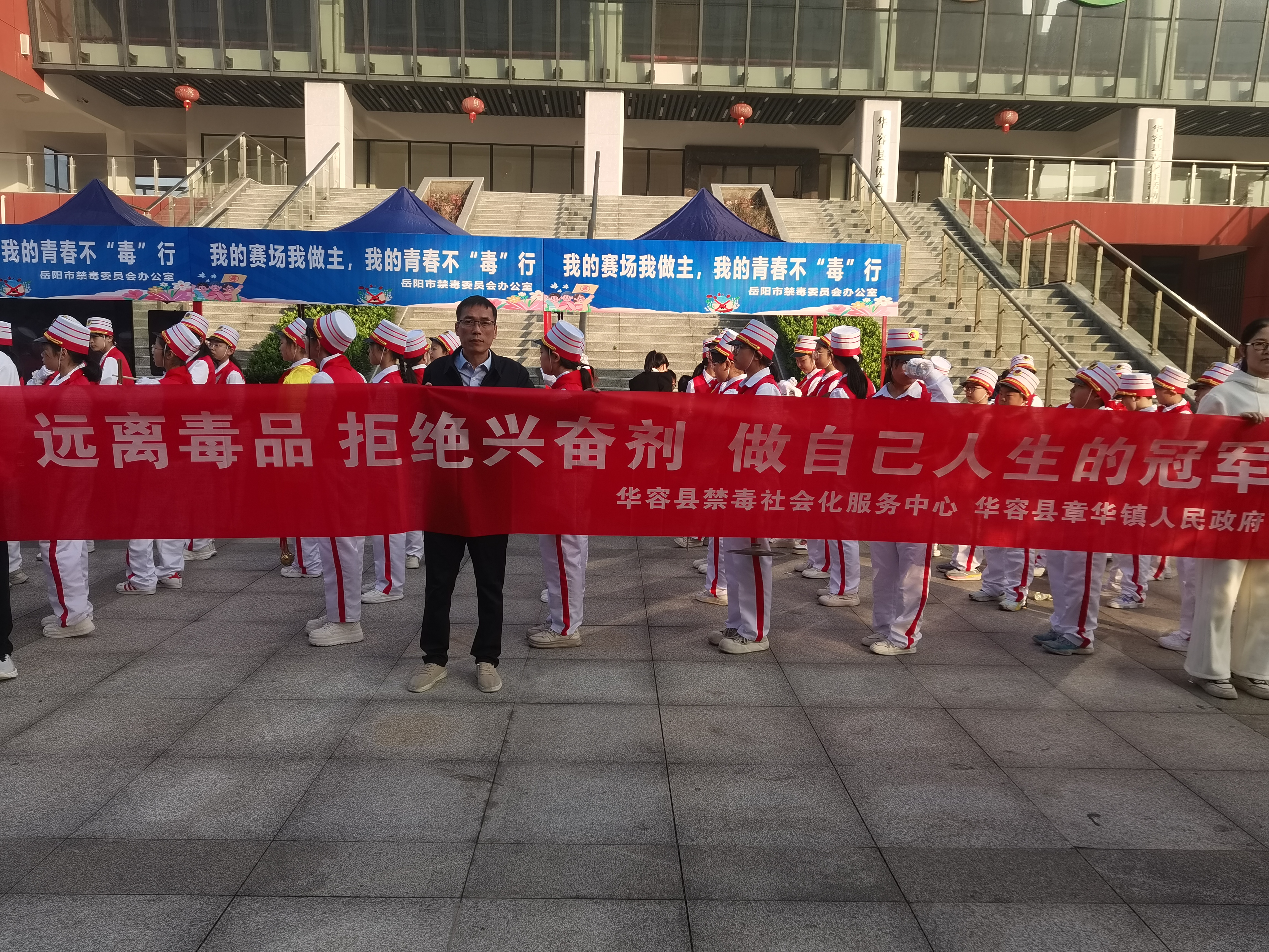 岳阳广电全媒体11月17日讯(记者/蔡群 通讯员/谢文)11月15日,岳阳市中小学生运动会开幕式在华容县职业中专隆重举行。以此为契机,岳阳市禁毒办、华容县禁毒社会化服务中心与华容县章华镇禁毒办联合开展禁毒和反兴奋剂融合宣传教育活动,为现场数千名师生送上了一堂精彩的“健康防护课”。