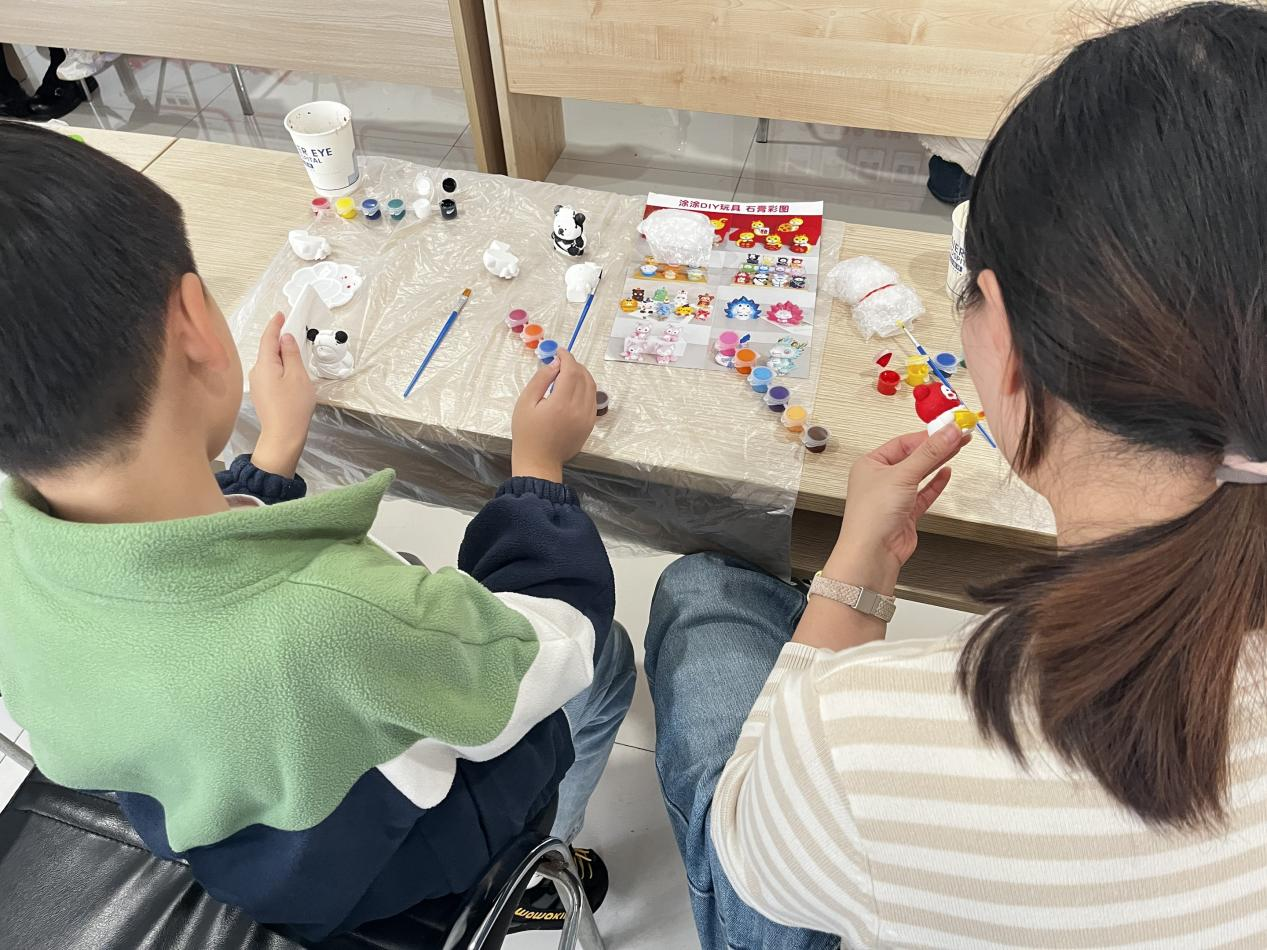 创作环节开始后,会员们纷纷拿起画笔,发挥想象力,为洁白的石膏娃娃勾勒线条、填充色彩。有的会员专注地为“小熊”涂上灵动的眼睛,有的家长和孩子分工合作,共同完成专属的创意作品,现场不时传来欢声笑语。活动过程中,屈光手术科的医护人员还穿梭在会员之间,耐心解答大家关于术后护理、视力保养的疑问,同时为大家普及眼部健康知识,让会员们在创作之余也能收获实用的护眼技巧。
