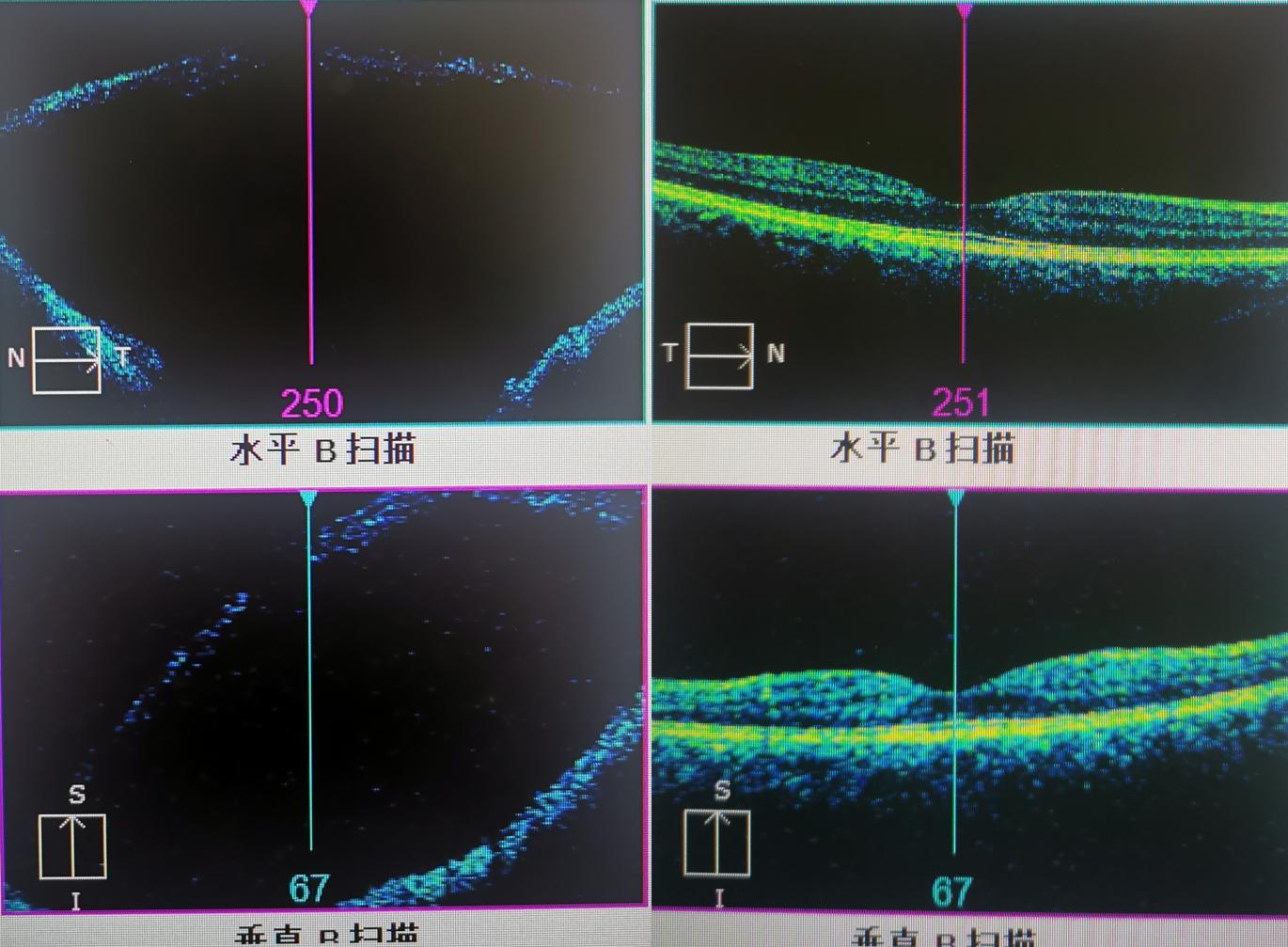 抵达岳阳爱尔眼科医院后,医院立即开启绿色就诊通道,眼底病科专家团队为其开展全面细致的检查评估。专科检查显示,曾阿姨右眼视力 0.6,左眼仅能看清 10cm 处指数,眼压虽基本正常,但左眼黄斑区可见网膜青灰色隆起,视网膜脱离情况危急。为精准制定方案,医院迅速安排双眼浅表组织器官 B 超、扫描激光眼底检查(SLO)、裂隙灯下眼底检查等专项项目,为手术提供了详实诊断依据。