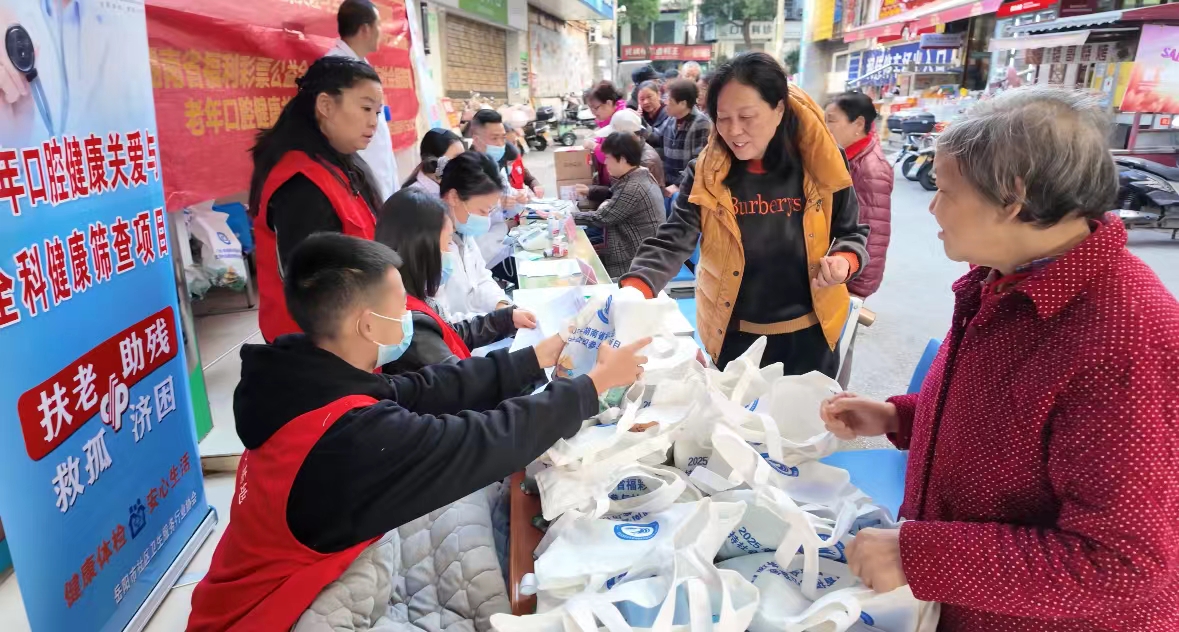 活动现场,医护团队与志愿者组成服务专班,提供四大核心免费服务:精准口腔健康评估排查隐患、实时血压血糖检测掌握身体动态、针对性慢性病咨询答疑、科学健康养护知识普及。医护人员耐心倾听诉求,细致记录身体状况,通过一对一问诊建立专属健康档案,以专业素养和温柔态度筑牢长辈健康防线。同步发放的100份爱心礼品袋,将实用物资与暖心关怀融为一体,生动诠释了福彩“扶老、助残、救孤、济困”的公益初心。