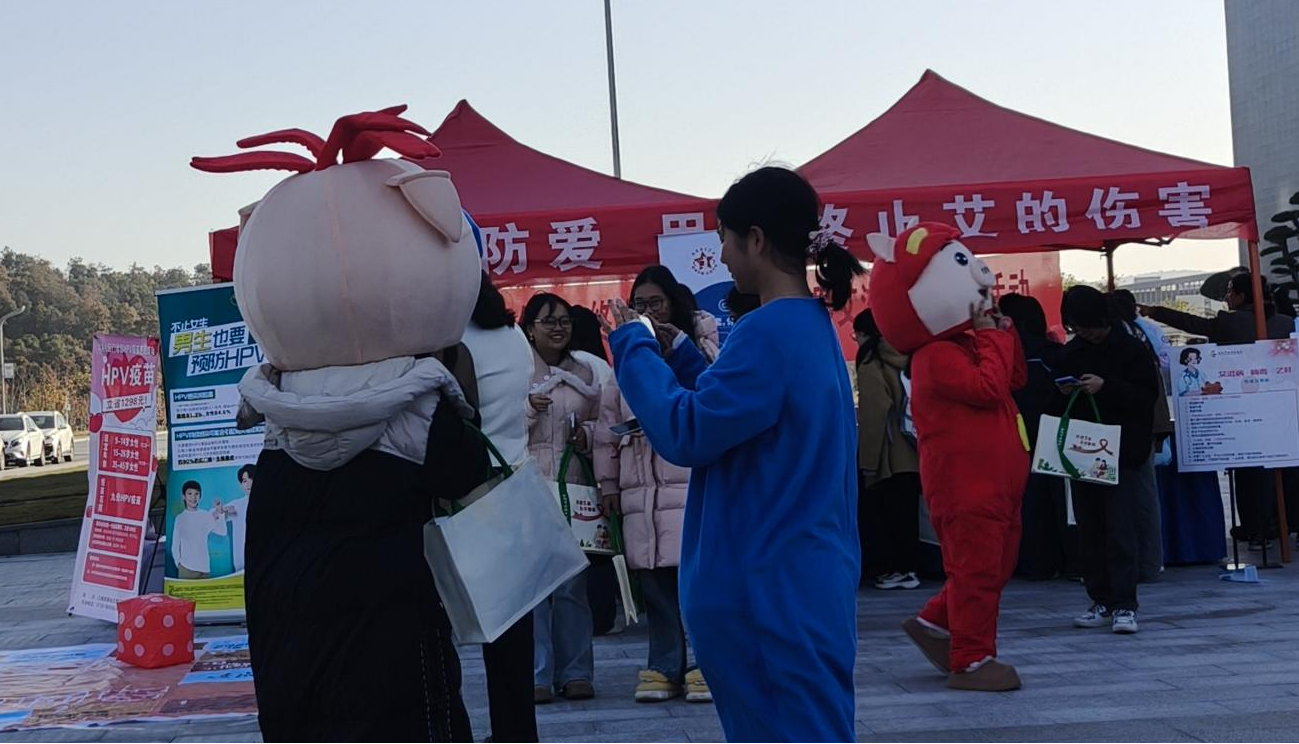 户外的图书馆前坪更是人头攒动,气氛热烈。同学们踊跃参与“防艾知识挑战转转转”“大富翁”等游戏,在欢声笑语中巩固了防艾知识。在“防艾“蕉”你戴套”体验区,专家用模型现场演示安全套的正确使用方法,解答了“中途佩戴是否有效”等关键问题,实用性强,吸引了众多学生驻足学习。而“爱的拥抱”活动则通过卡通人偶互动,鼓励同学们合影发朋友圈,以实际行动传递了对艾滋病感染者的理解与支持,有力地推动了反歧视宣传。