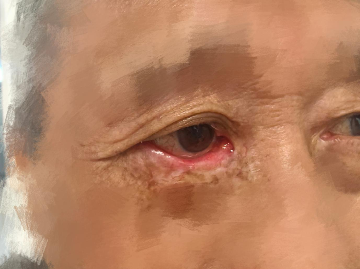 回忆起意外发生的场景,张大爷仍心有余悸。今年 9 月,他在家中烧水时,刚烧开的沸水不慎溅到右眼,瞬间传来灼热刺痛感。“当时觉得只是皮外伤,就自己找了支烫伤膏涂了涂,没当回事。” 张大爷说,起初眼部只是轻微红肿,他以为会慢慢好转,没想到一周后,右眼上睑开始向外翻卷,眼皮再也合不上了。
