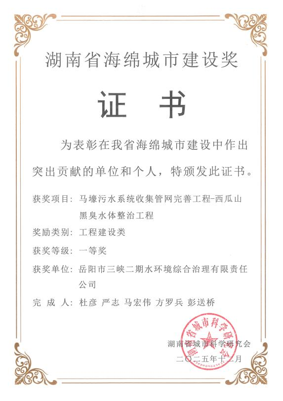 近日,由三峡集团岳阳公司牵头实施的西瓜山黑臭水体整治工程被湖南省城市科学研究会授予“湖南省海绵城市建设奖”一等奖荣誉称号,这既是对岳阳市海绵城市建设治理成效的专业认可,更是对三峡集团共抓长江大保护“岳阳模式”创新实践的高度肯定。
