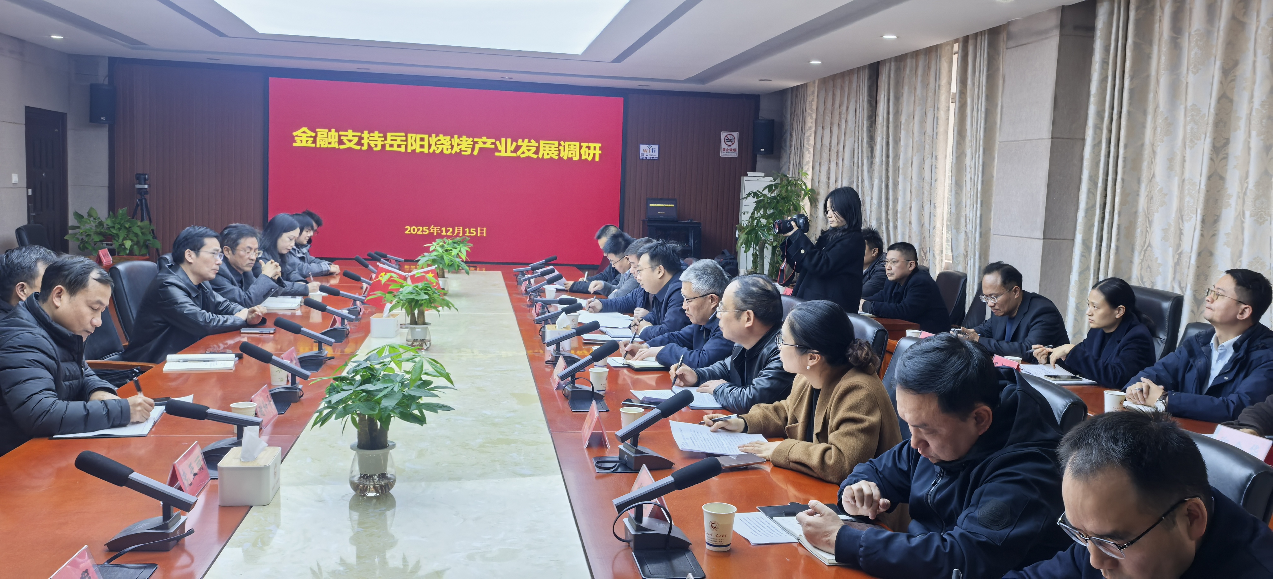 为贯彻落实中央经济工作会议关于“坚持内需主导,建设强大国内市场”的精神,人民银行岳阳市分行行长覃兆勇带领工商银行、农业银行、湖南银行、长沙银行、农商银行等分行负责人,于12月15日下午主动下沉岳阳烧烤学院(岳阳烧烤研究院),就金融行业如何支持岳阳烧烤产业发展展开调研。岳阳开放大学党委书记乐艳华、党委委员、副校长姜宗福,市商务局、市烧烤学院、市烧烤协会相关负责人和相关烧烤企业代表参加。