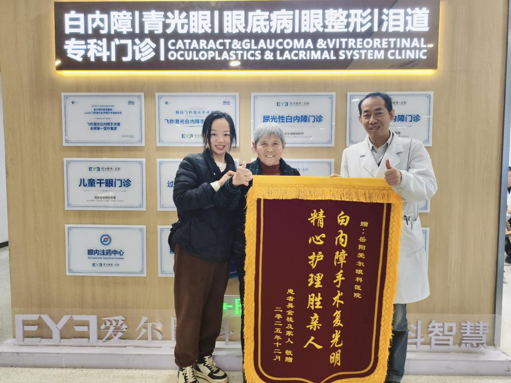 岳阳广电全媒体12月25日讯(通讯员/曾庆琳)近日,在岳阳爱尔眼科医院的复查室内,73岁的吴奶奶用那双因类风湿性关节炎变形的手,将一面写有“白内障手术复光明,精心护理胜亲人”的锦旗,郑重交到岳阳爱尔眼科医院院长鲁红宇手中。这面锦旗,它不仅承载着一位老人告别朦胧视界的由衷感激,也成为湖南省“友好湖南·光明助残-爱眼公益行”眼疾救助行动温暖基层、精准帮扶的真实见证。
