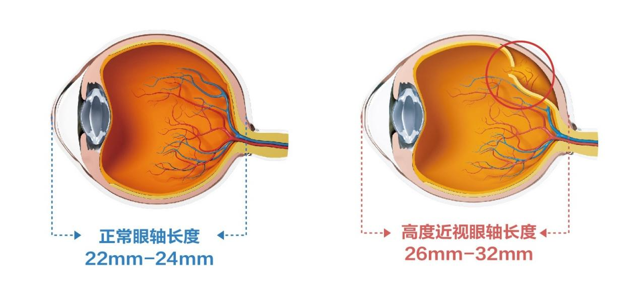 医学上,近视度数超过600度即为高度近视,其中超过1000度为超高度近视。高度近视的核心成因的是眼轴被逐渐拉长,就像把眼球这个“气球”过度吹大,导致视网膜、脉络膜等眼底组织被拉伸变薄,失去原有弹性,变得异常脆弱。正常成年人眼轴长度约23.5-24mm,每增长1mm,近视度数约增加300度,眼轴越长,眼底病变风险越高。