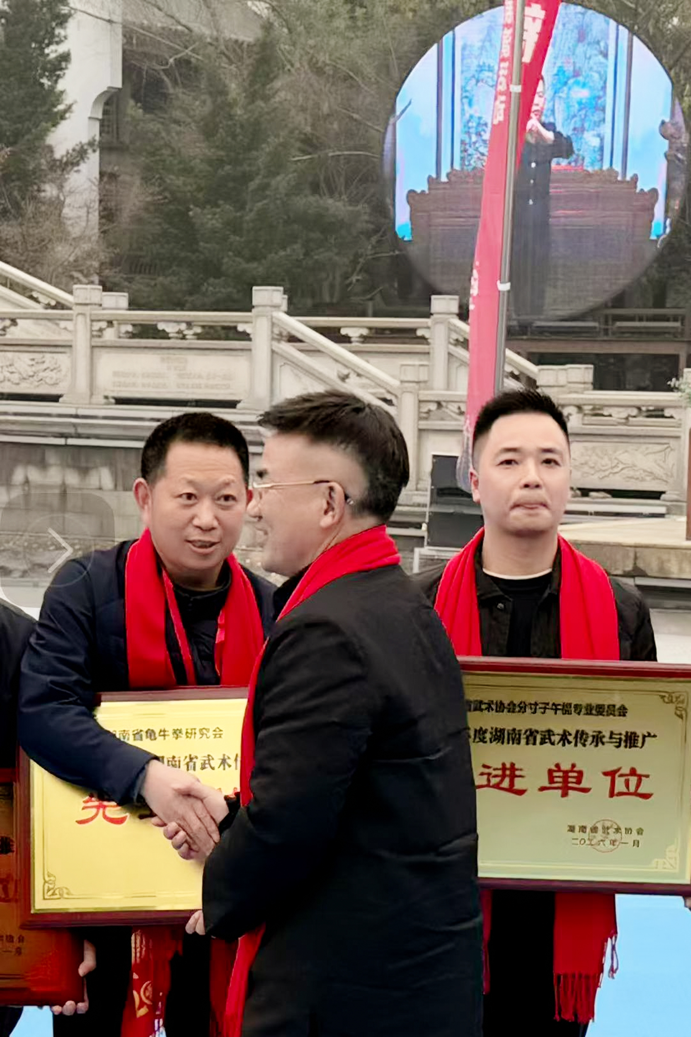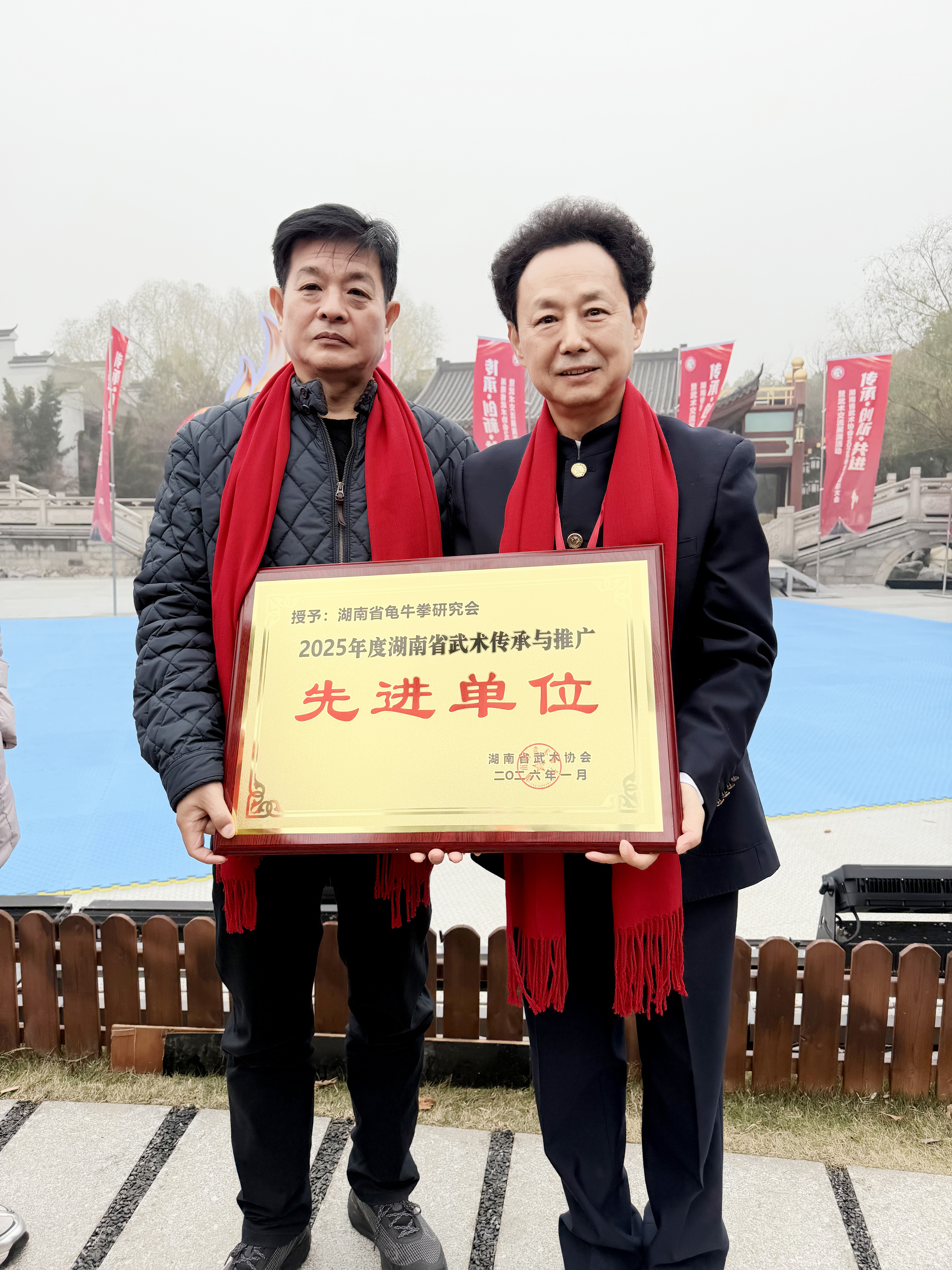 湖南理工学院体育学院副院长、省武协副主席、湖南省龟牛拳研究会执行会长张一龙代表研究会上台领取先进单位奖牌。其本人曾获湖南理工学院“师德十佳”“先进工作者”等荣誉,秉持武德、团结同仁,在武术推广中展现出良好的组织协调与资源整合能力。