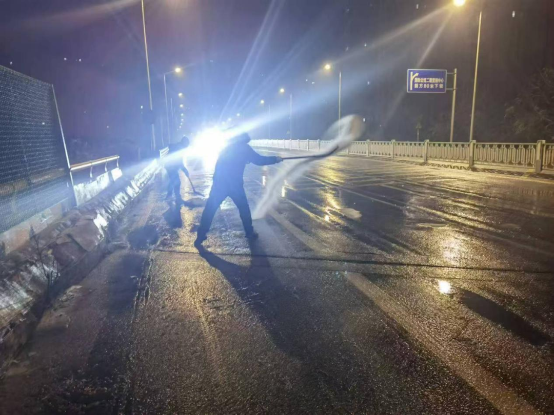 龙山管理处各支部在预警发布后便提前划分责任区,20日清晨6点,党员志愿者已在郭镇集镇路口、赶山路桥下等易结冰路段开展预防性撒盐作业。