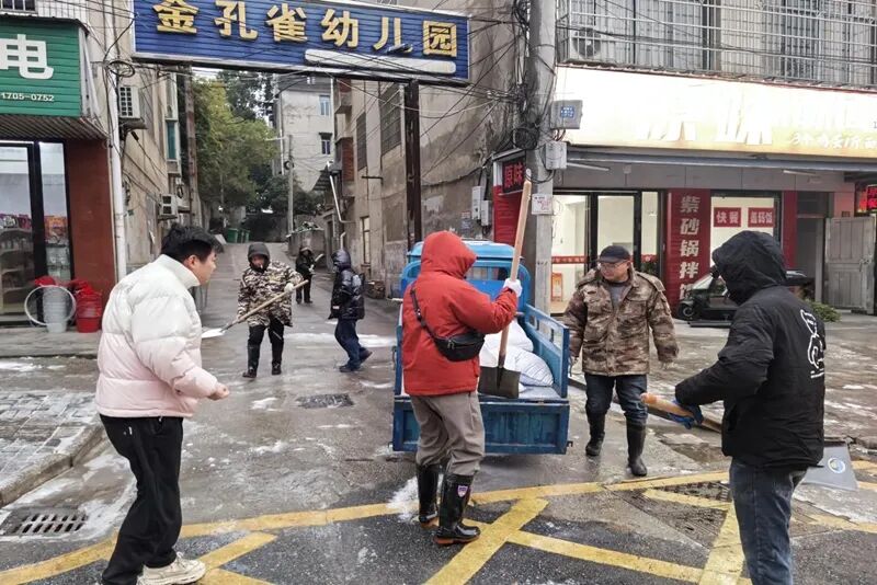 求索街道党员干部在巡查中发现多个小区地下车库坡道存有结冰风险,立即协调铺设防滑麻袋,并安排党员轮流值守,杜绝安全隐患。从预警到响应,从桥梁到背街小巷,党旗始终飘扬在除冰保畅的最前沿。