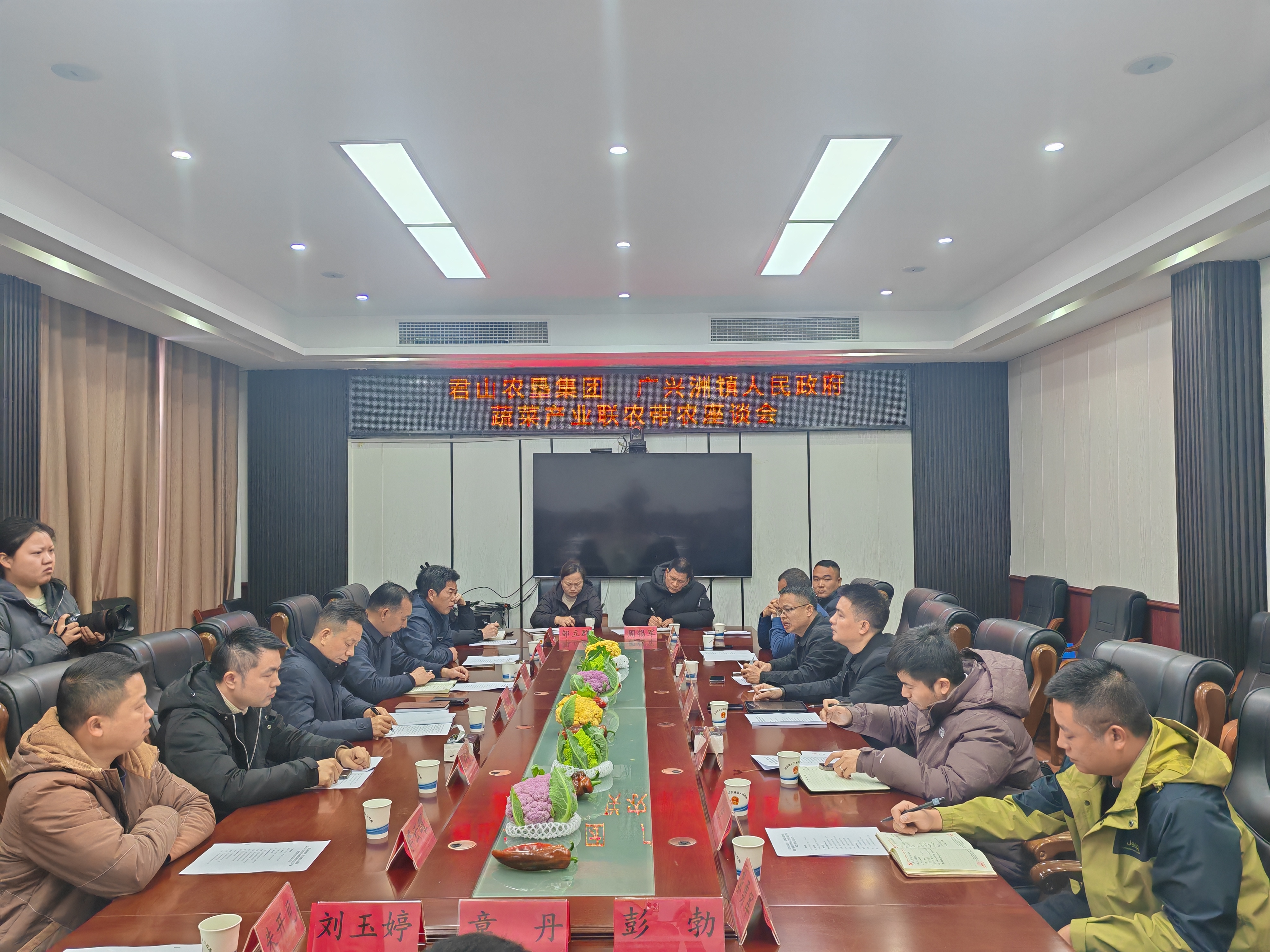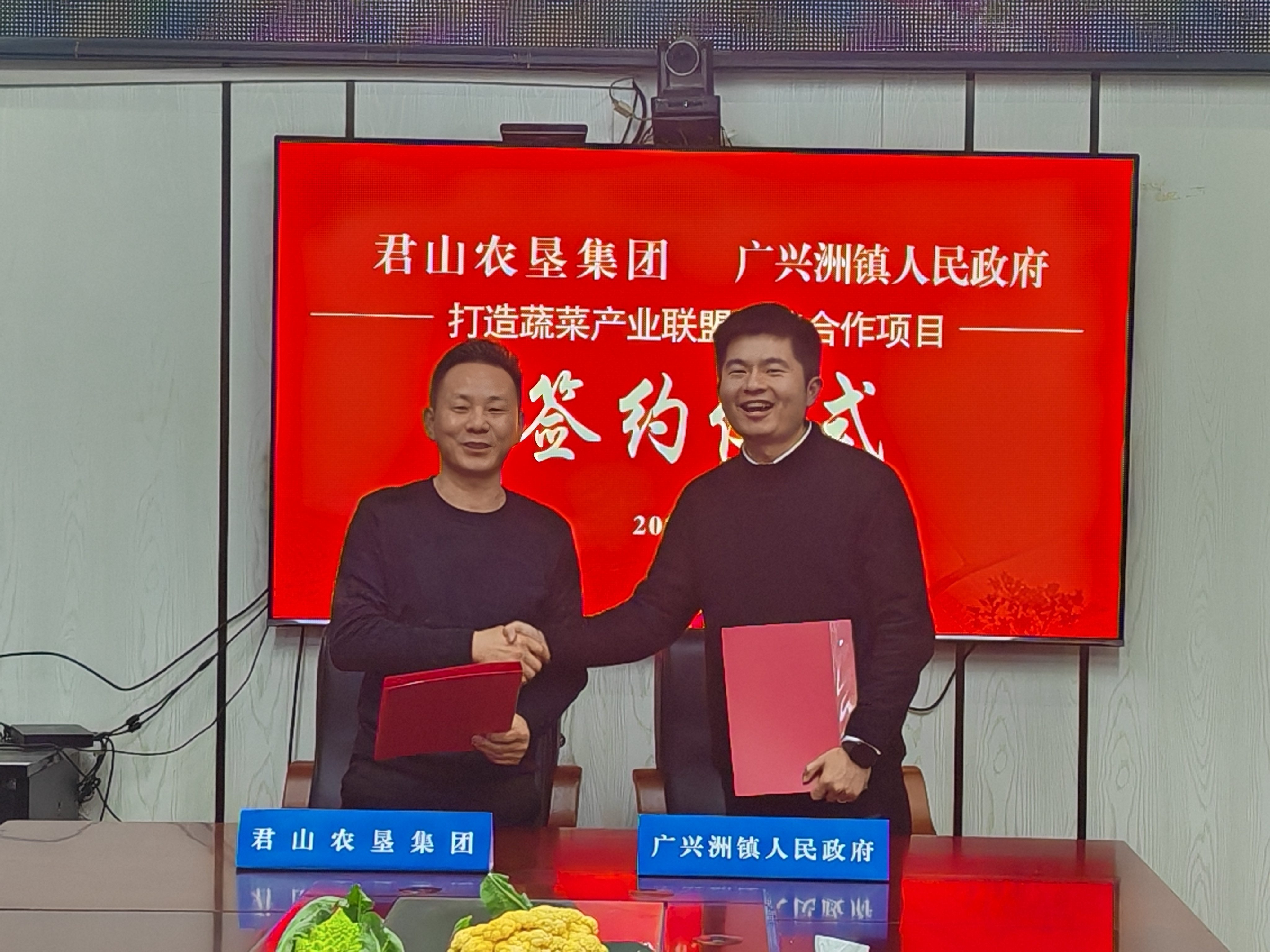 1月24日,蔬菜产业联农带农座谈会暨打造蔬菜产业联盟签约仪式启动。该活动由君山农垦集团、广兴洲镇人民政府联合举办,君山农垦集团、广兴洲镇主要负责人和相关负责人、蔬菜产业领域专家、经纪人、蔬菜种植专业合社负责人、蔬菜加工企业负责人为蔬菜产业提质升级建言献策,畅所欲言。在他们的见证下,君山农垦集团党委书记、董事长聂磊,广兴洲镇人民政府镇长方鑫坦共同签署了《蔬菜产业发展战略合作协议》。
