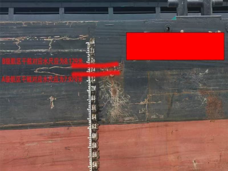 岳阳广电全媒体讯(通讯员 郭强)1月26日,岳阳城陵矶海事处执法人员在辖区芦席洲锚地对“宝泰**”轮实施现场监督检查过程中,执法人员结合船舶型深、满载吃水,A、B级航区干舷高度等数据相对应,发现该轮水尺标识存在异常:根据船舶检验证书规定,该船A级航区干舷位置对应的核定吃水应为7.979米,但实际勘划位置仅对应吃水7.3米;B级航区干舷位置对应的核定吃水应为8.129米,但实际勘划位置仅对应吃水7.5米,相当于该船水尺标识整体修改上移了0.6米。因此,该船当前吃水线标识的吃水为4.75米,但是其实际吃水为5.35米,已经远远超过该水域当前航道维护水深5.0米。