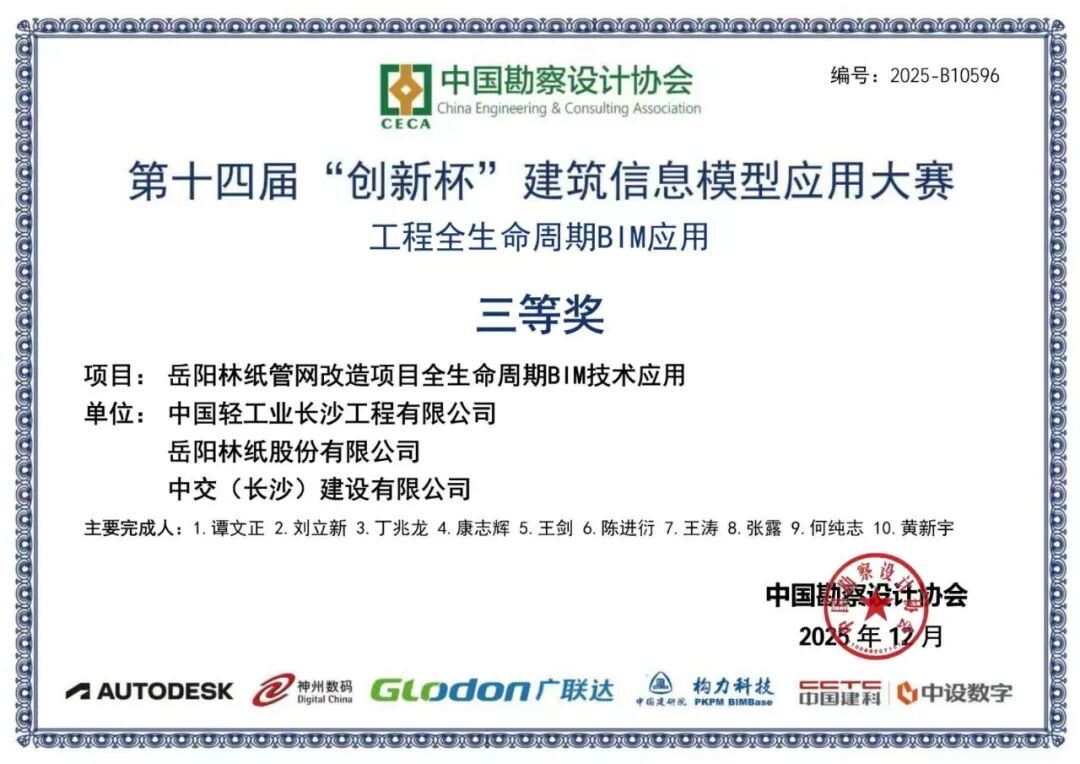 近日,第十四届“创新杯”建筑信息模型(BIM)应用大赛评选结果正式公布,岳阳林纸与中国轻工业长沙工程有限公司、中交(长沙)建设有限公司共同申报的项目——《岳阳林纸管网改造项目全生命周期BIM技术应用》获得三等奖,成为公司推动数字化转型方面的又一重要成果。