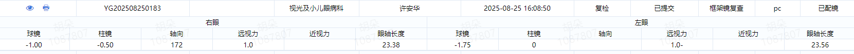 到2025年8月复查时,由于小曹在家只有写作业和看电视时才戴眼镜,右眼度数又增长了25度,左眼更是增长了50度。面对快速发展的近视,接诊医生在重申全天戴镜必要性的同时,经过全面评估,建议为其制定并启动了“光学矫正眼镜+药物干预” 的联合防控方案。