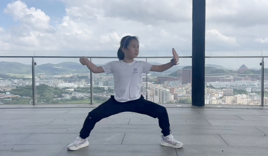 交流中,三位龟牛拳传承人小孩何明骏、严柏杰、谭子濠率先进行基本功展示。