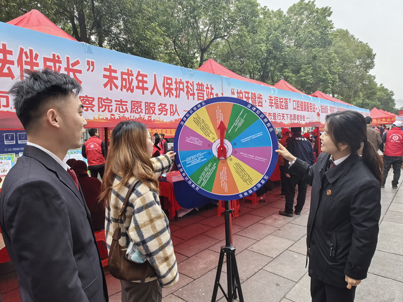 “答对这道题可以转一次转盘赢奖品。”在“法治能量站”互动区,干警们精心设计的“法律知识转转乐”游戏吸引了不少市民参与。转盘上写满了与青少年日常生活密切相关的法律题,参与者转动转盘、回答问题,答对即可获得法治书签、主题文具等普法小礼品。
