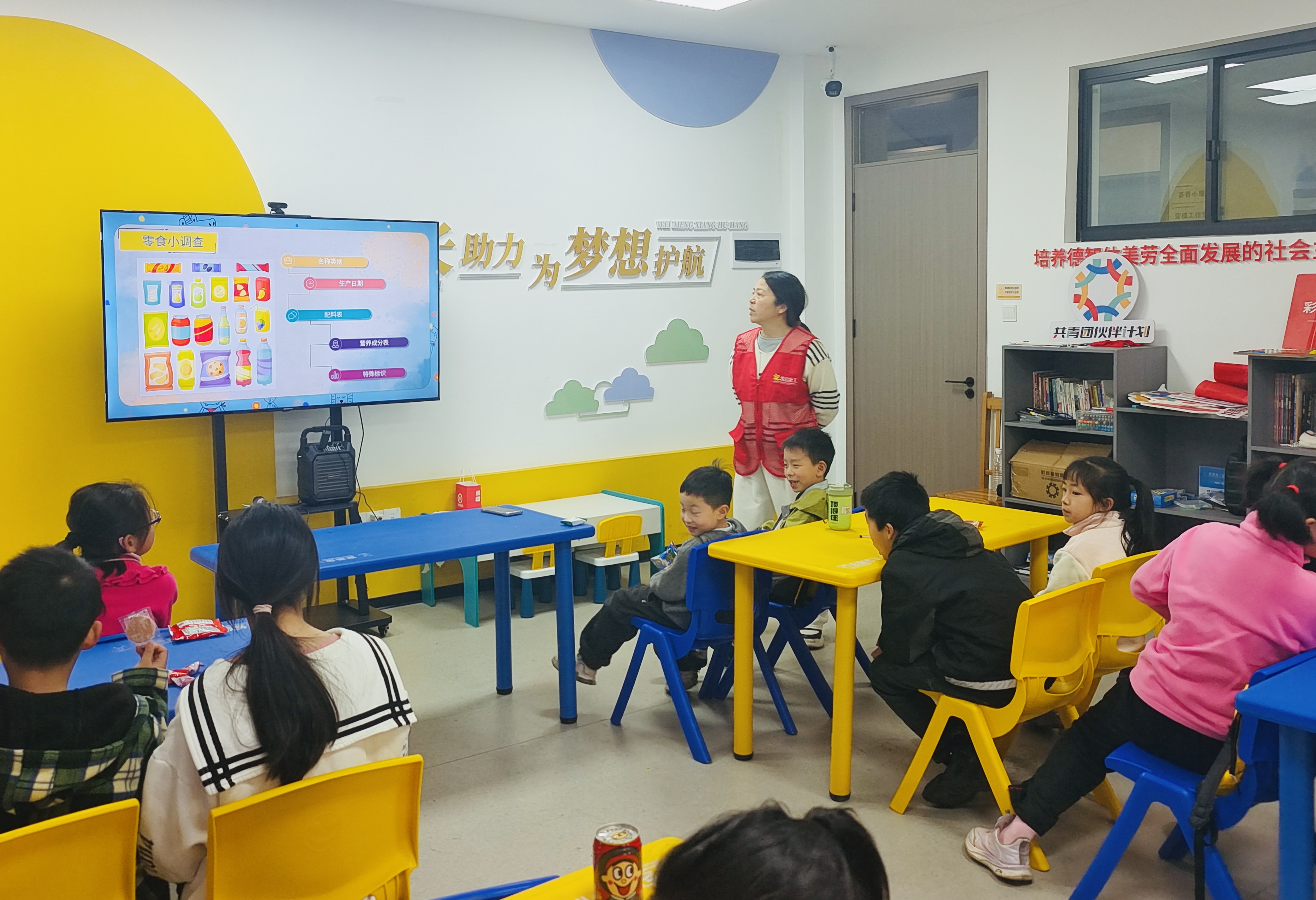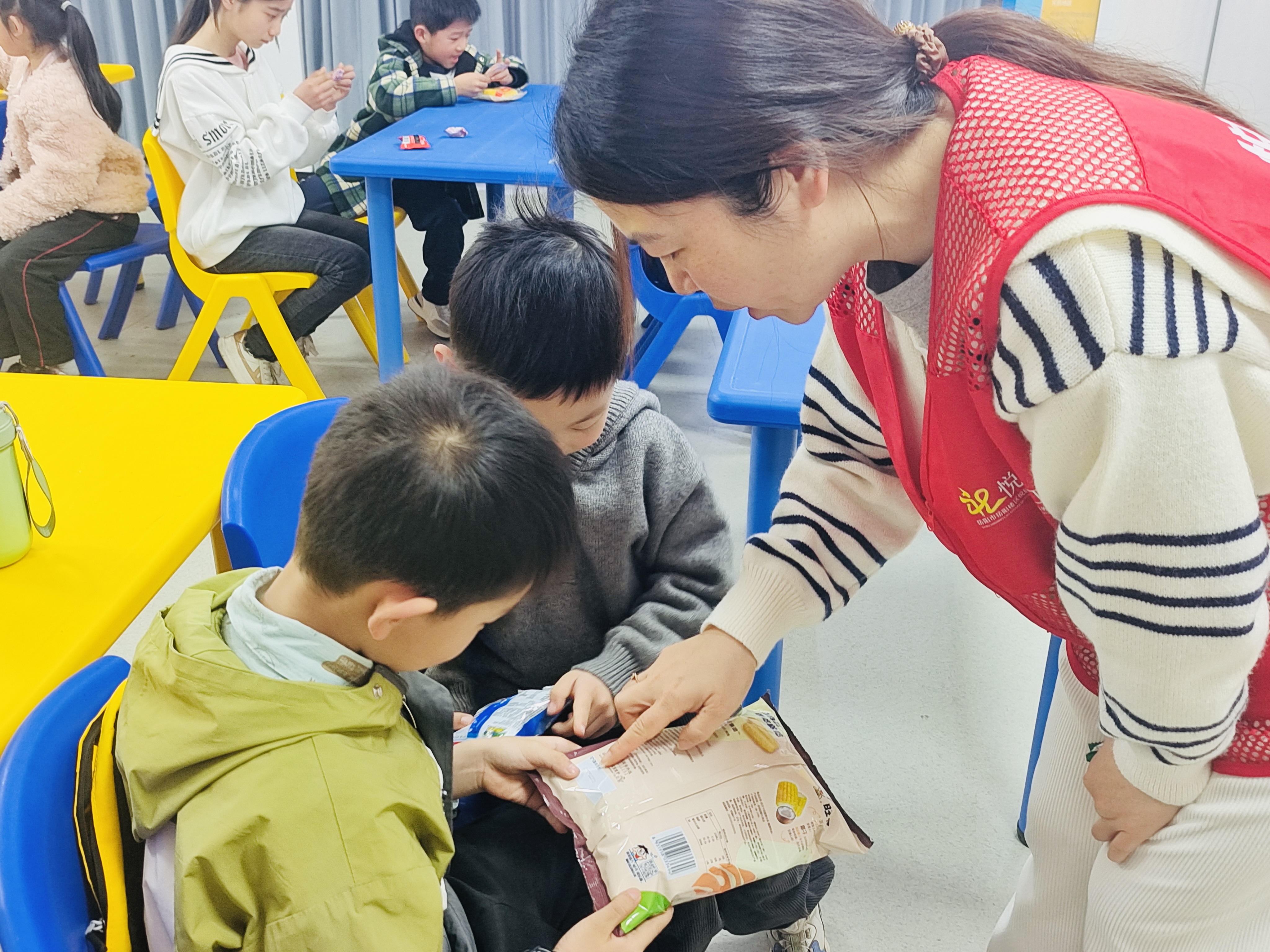 活动现场干货满满、互动感拉满!志愿者讲师先以一堂生动易懂的政治引领公开课开场,用孩子们能听懂的语言,引导大家关注自身健康、树立正确的自我保护意识。随后,讲师紧扣“食品安全”核心,从孩子们常吃、爱吃的零食入手,通过趣味提问、互动讨论的方式,手把手教大家掌握“儿童零食安全四要素”:查生产日期与保质期、认正规厂家与QS标志、看配料表成分顺序、警惕过分鲜艳色泽和浓烈香味。孩子们听得专注、踊跃举手,现场氛围十分热烈。