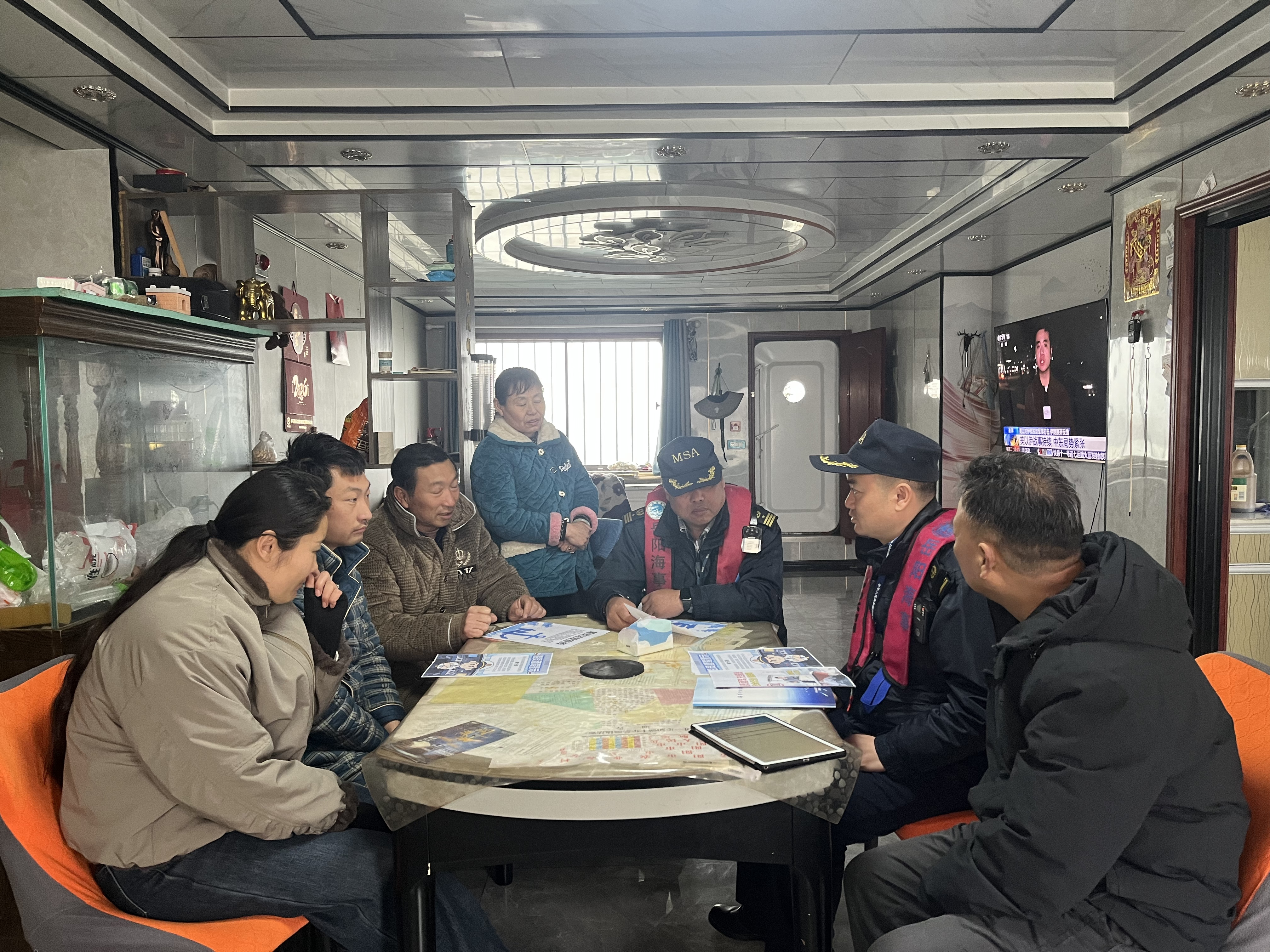 为强化宣传实效,海事执法人员还向船员发放了普法宣传手册、安全警示海报等资料,现场解答船员关于值班规范、认定依据、处罚标准等疑问,推动普法宣传覆盖每一位在岗船员。