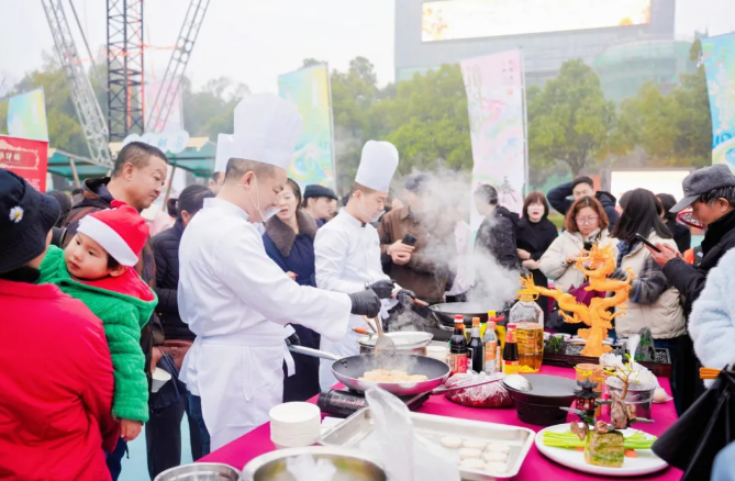 开幕式现场,锣鼓喧天、瑞气盈门。专业舞龙舞狮队精彩表演,金龙翻腾、彩狮跃动。同步举行的民俗厨艺争霸赛更是人气爆棚,来自城区10家餐饮企业同台竞技、各显神通,煎炒烹炸轮番上阵,热油滋滋作响、香气四溢,围观群众拍照围观,赞叹声此起彼伏。